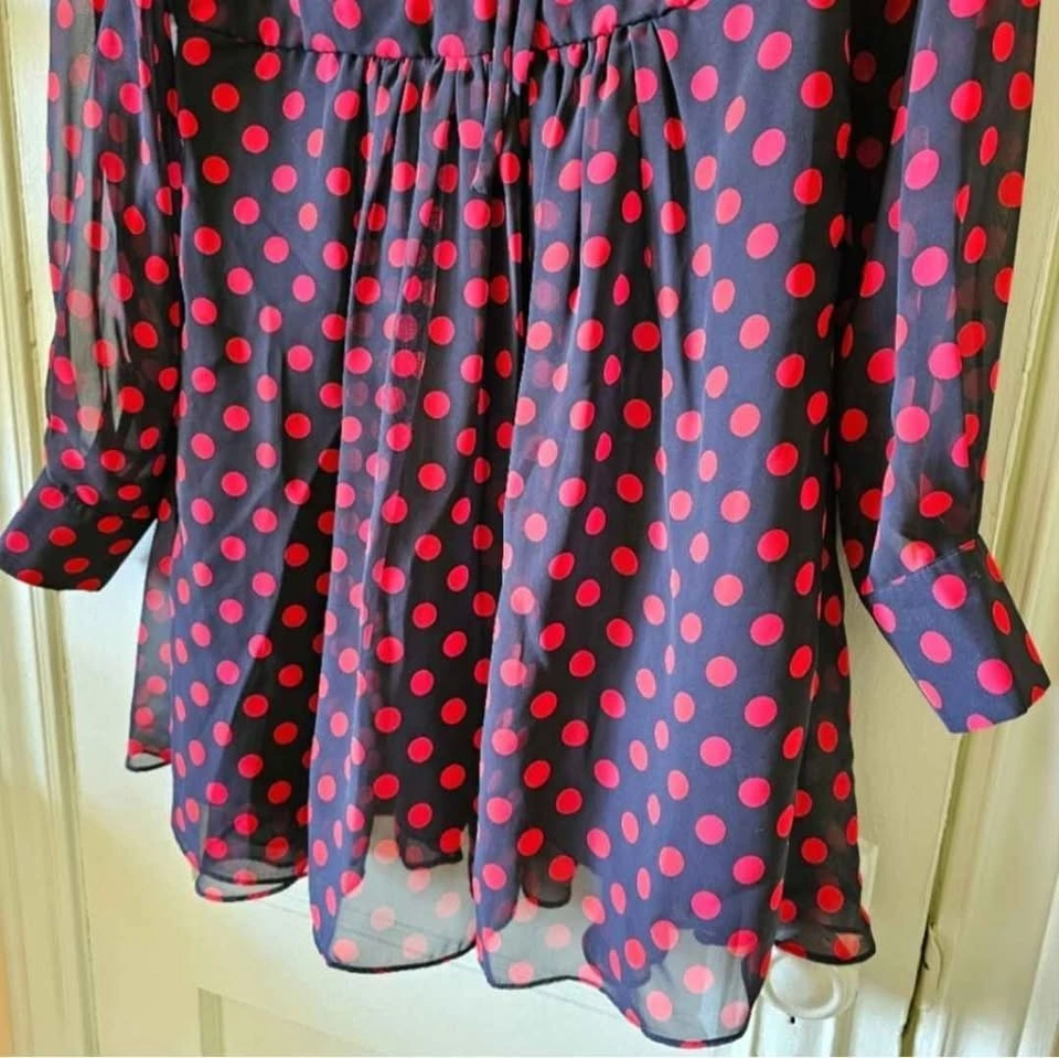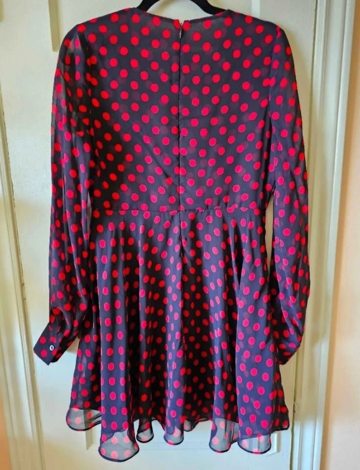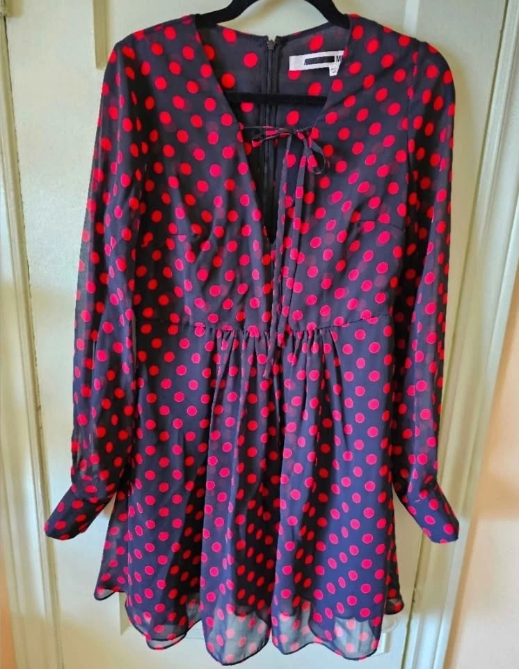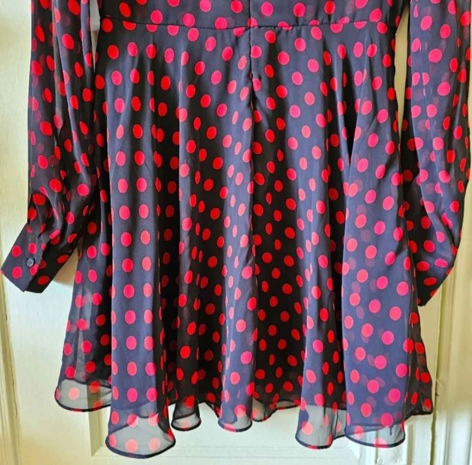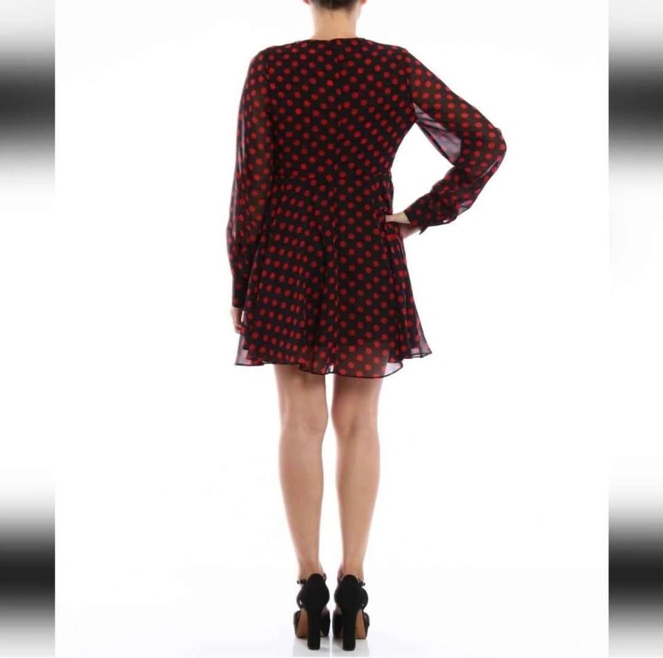 McQ by Alexander McQueen chiffon mini dress in black and red polka dot print. Dress features a V-neck with ties that form a bow at the collar, an A-line cut that flares from the waist, and a hidden rear zipper. The body is fully lined, while the sleeves are unlined and have button cuffs.