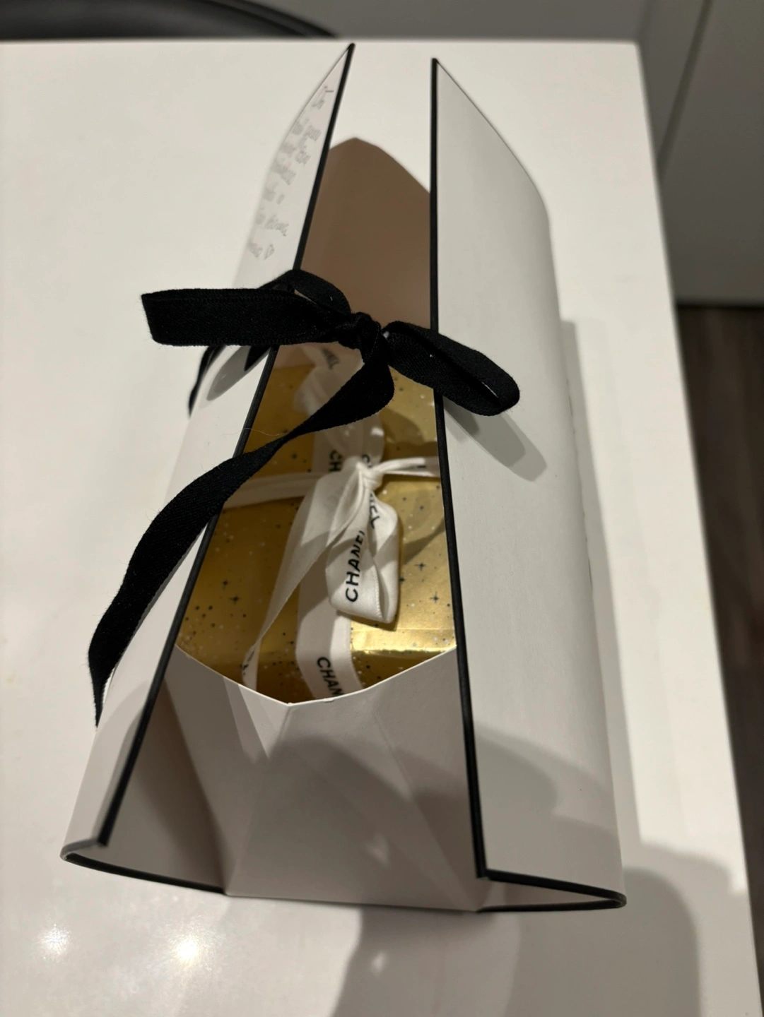 Comes with Chanel wrapping paper. Can provide white cardboard wrapping as well, but it has a message written on it.