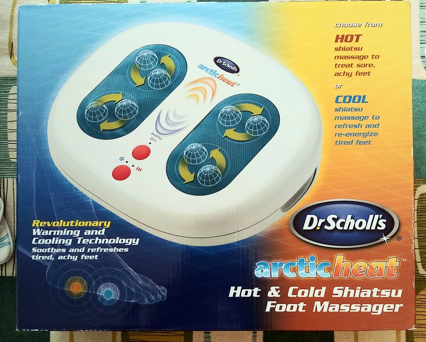 Get ready to soothe those tired, achy feet with the Dr. Scholl's Arctic Heat Hot & Cold Shiatsu Foot Massager! This massager features revolutionary warming and cooling technology to refresh and re-energize your feet. It's designed for deep muscle relief with easy foot-operated controls. Comes in the original box!