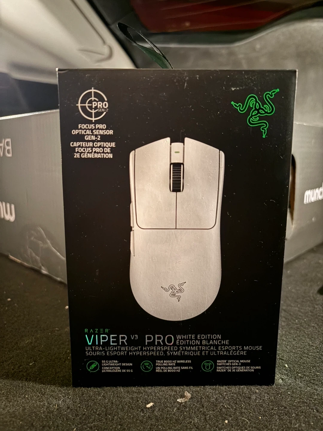Selling a Razer Viper V3 Pro wireless gaming mouse in white. It’s brand new still sealed in the box and has never been opened used or taken out of the box. Ultra-lightweight design with focus pro optical sensor gen 2. Up to 95 hours of battery life. Includes USB Type A to Type C cable and grip tape.