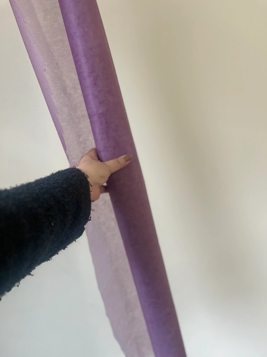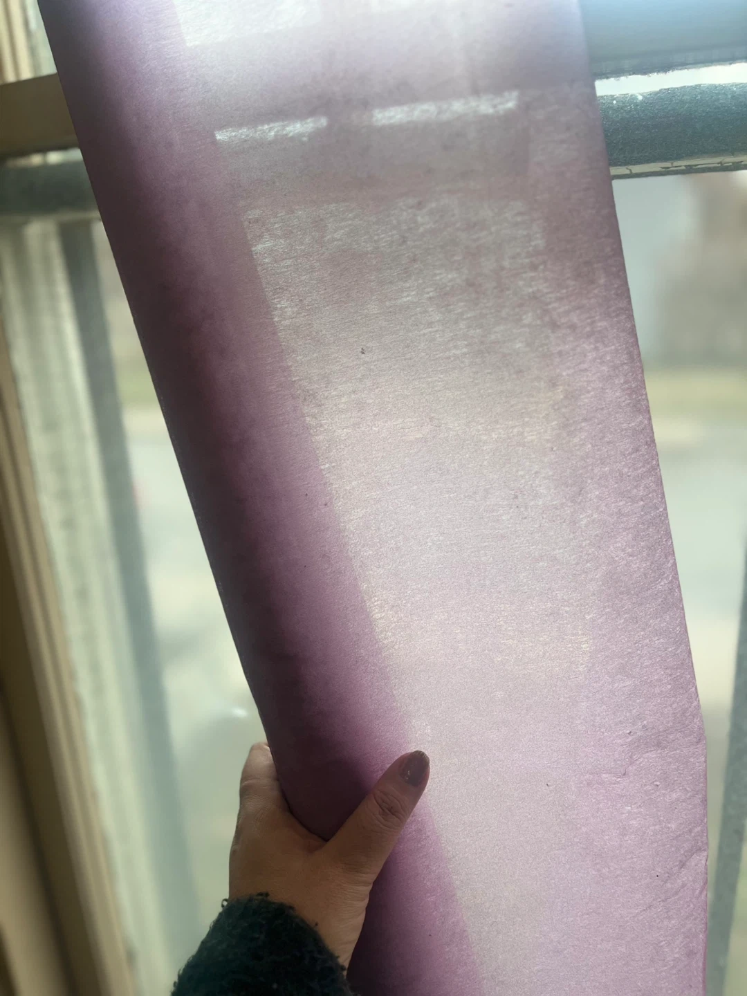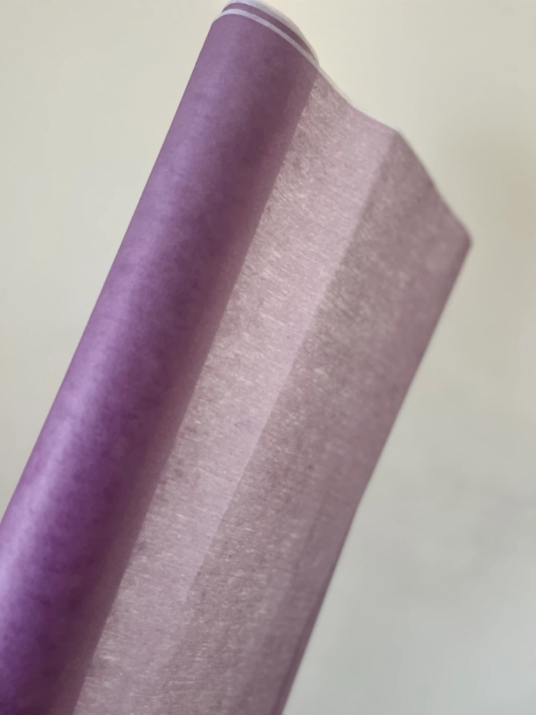 A roll of lilac organza fabric. It's thin and has a delicate texture. Perfect for crafting or decorative wrapping projects! Leftover from a window shade project also have a roll of soft blue leftover