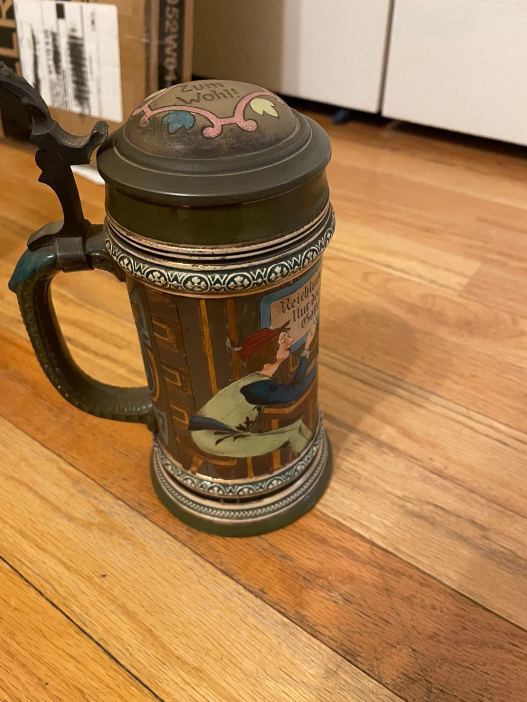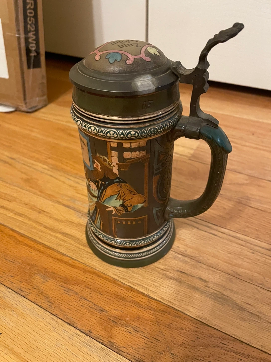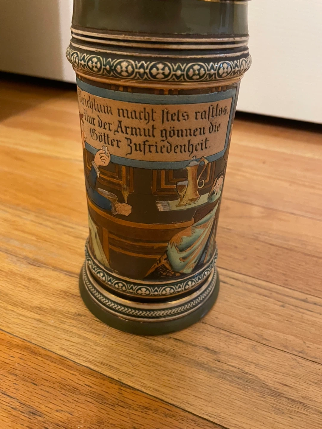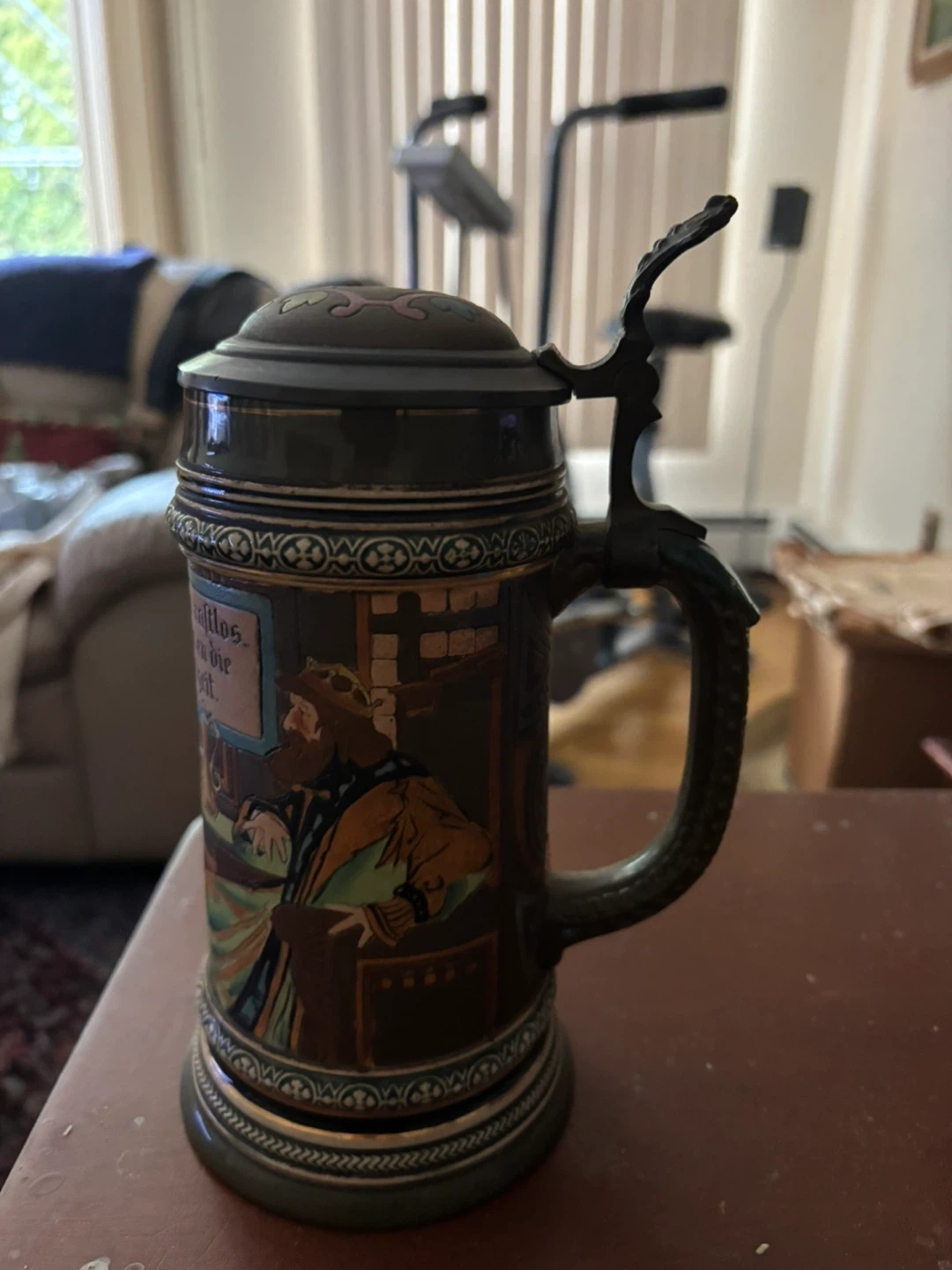 Selling a vintage German beer stein. It's in good condition and has a unique design with German text and illustrations. Perfect for collectors or anyone who appreciates traditional German craftsmanship. Selling to cover uncle funeral expenses