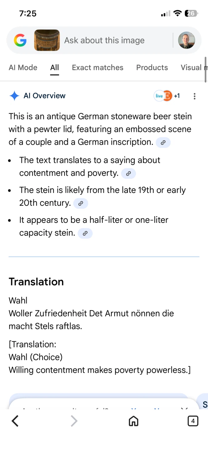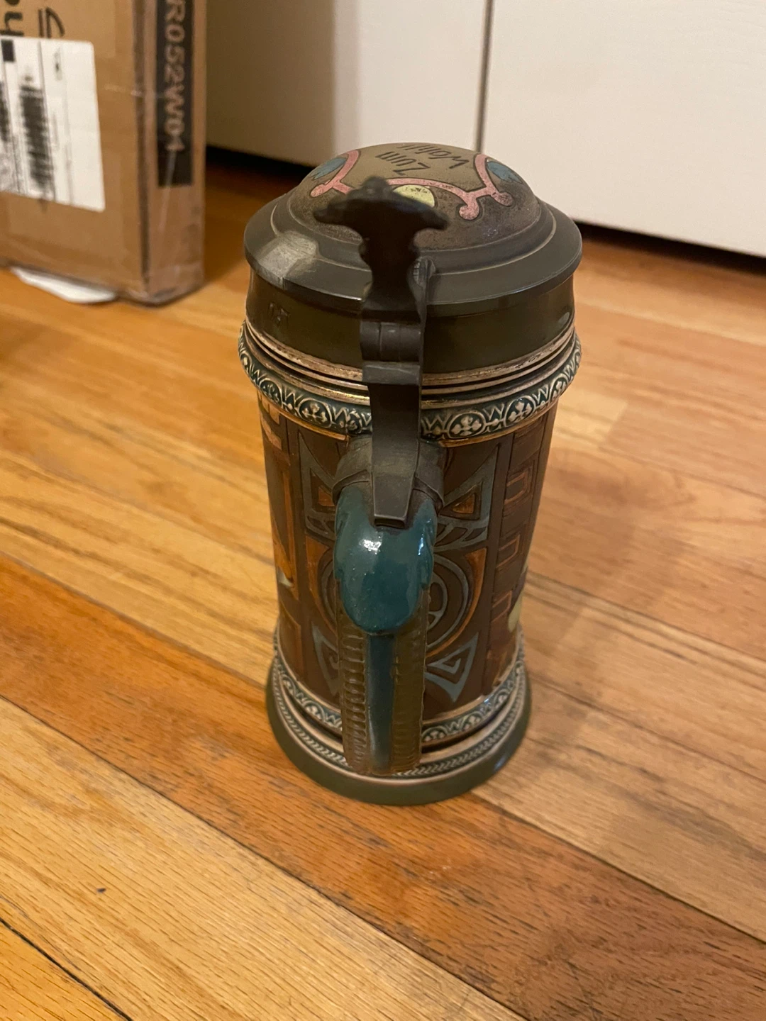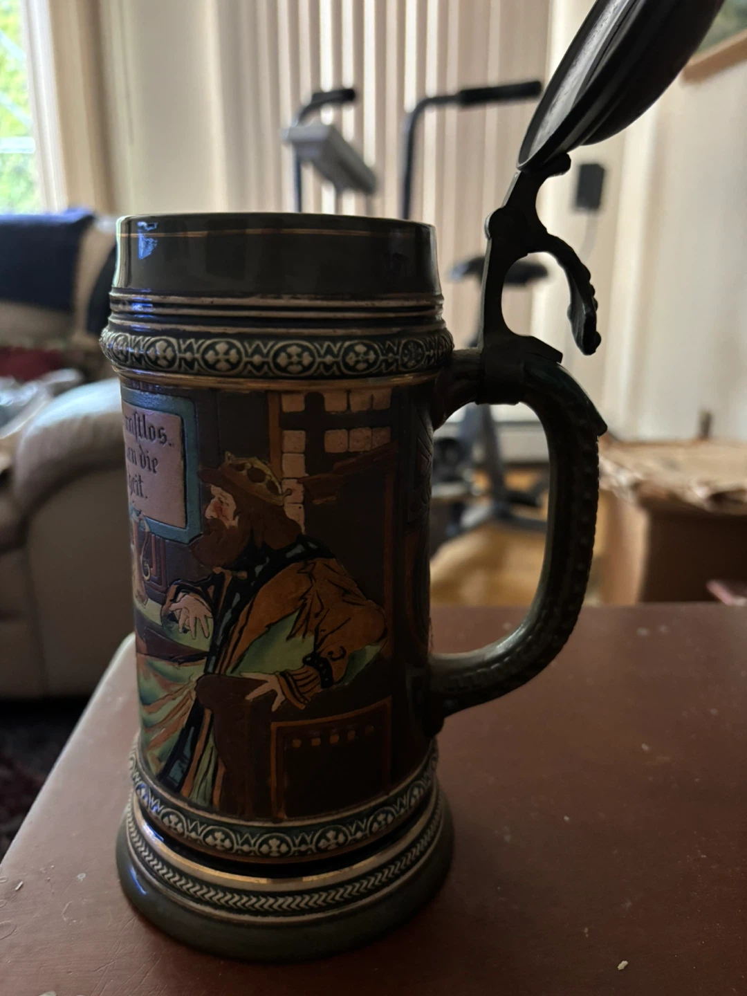 Selling a vintage German beer stein. It's in good condition and has a unique design with German text and illustrations. Perfect for collectors or anyone who appreciates traditional German craftsmanship. Selling to cover uncle funeral expenses