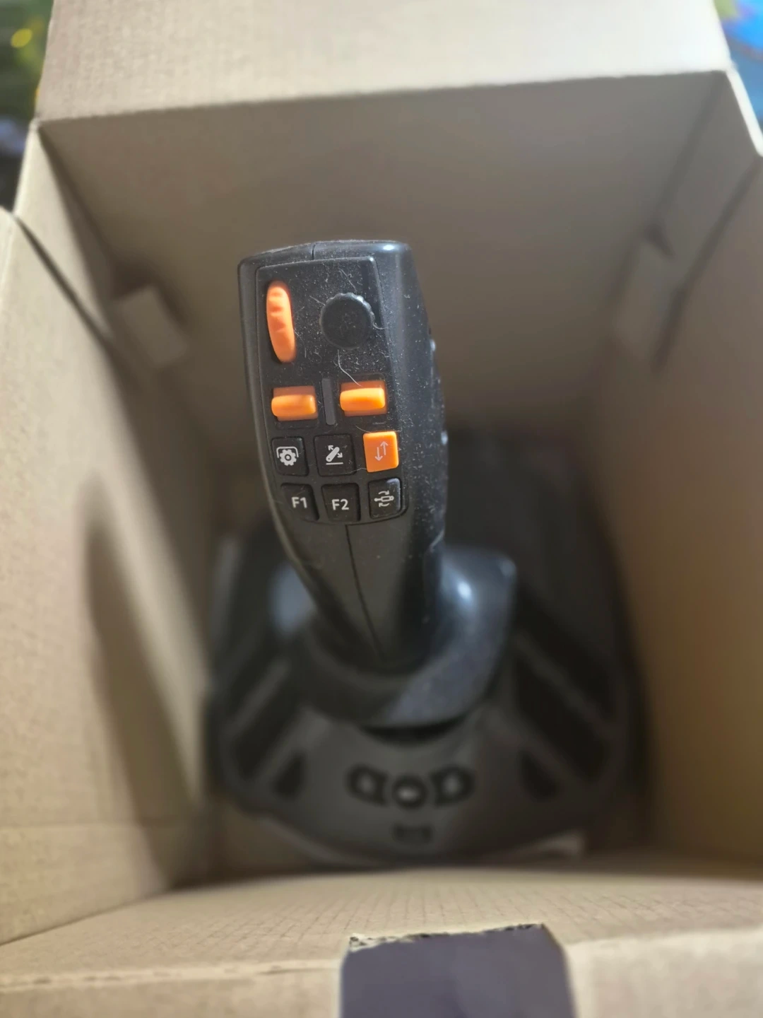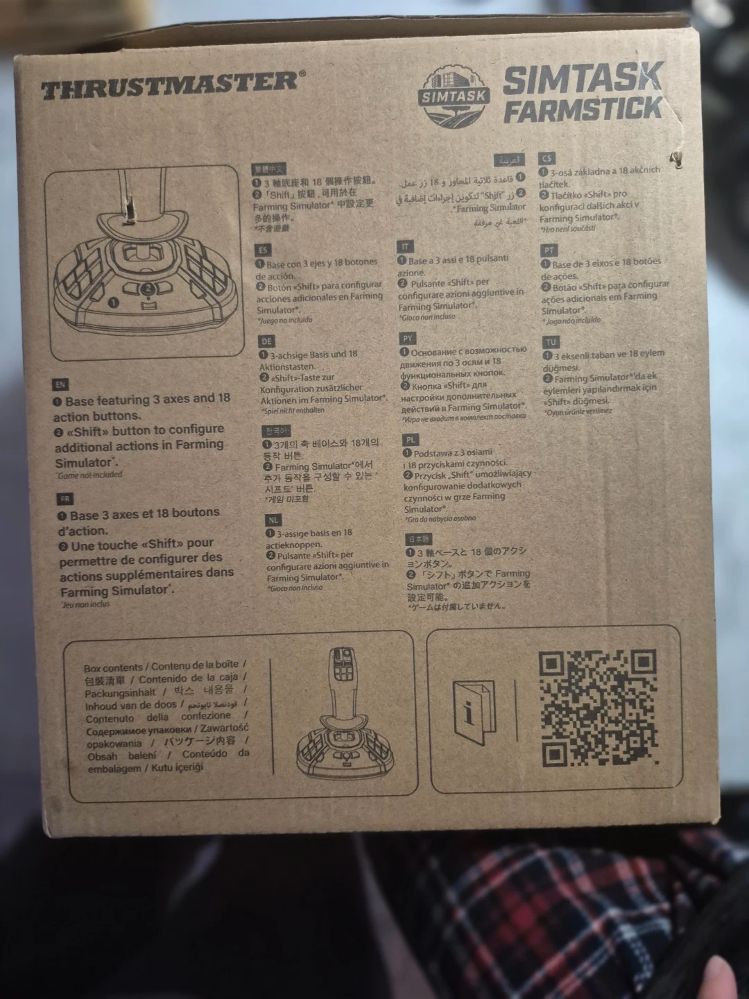 This is the Thrustmaster SimTask Farmstick, designed for Farming Simulator. It features 3 axes and 18 action buttons, plus a twist handle for additional control. The base includes 3 axes and 18 buttons, along with a twist grip for more ways to configure your in-game actions. It's great for enhancing your farming simulation experience!