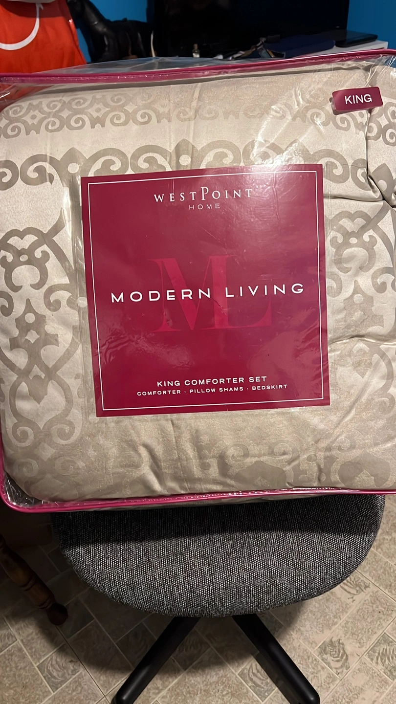 This is a King comforter set from West Point Home's Modern Living collection. It includes a comforter, pillow shams, and a bedskirt. The set is designed in a worldly and new traditional style with luxurious fabrics and elegant details.