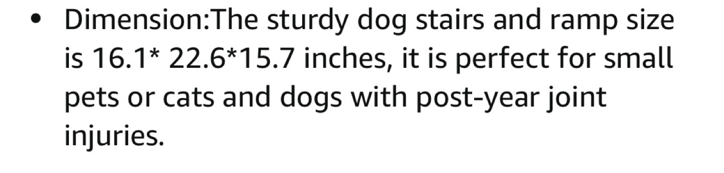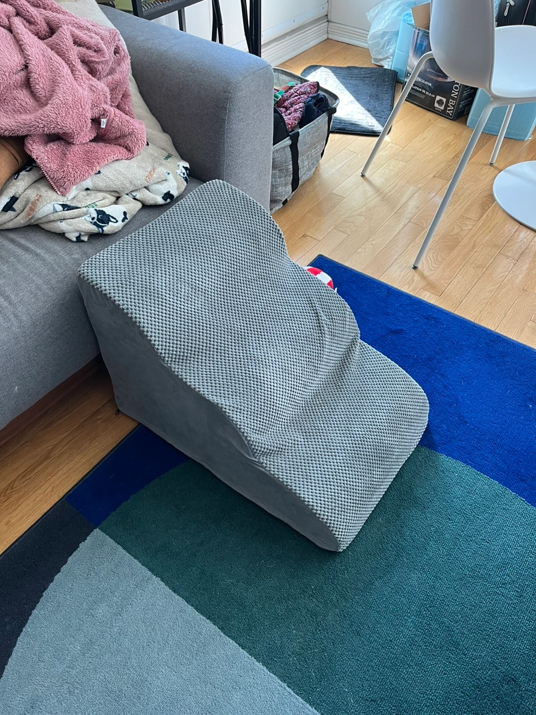 Grey pet stairs, three steps. Durable high-density open foam. Washable cover. Pet hair remover roller included. Reduces stress on pet joints. Easy to walk up and down. Perfect for small pets or dogs with joint injuries. Measures 16.1"*22.6"*15.7"