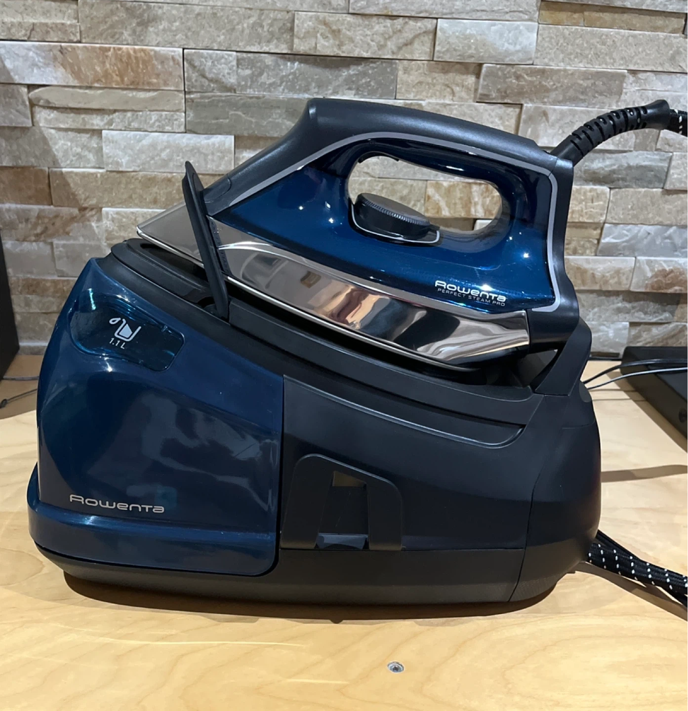 Rowenta Perfect Steam Pro steam generator iron in a deep blue colour. It has a 1.1L water tank capacity. This iron provides powerful steam for efficient wrinkle removal.