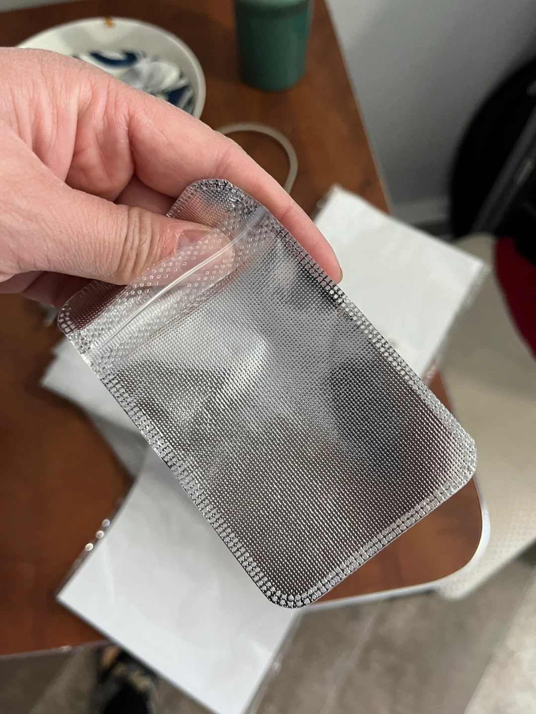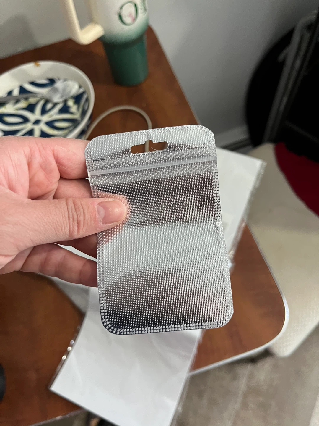 This is a pack of clear, resealable pouches. They're made of durable plastic and feature a zip-lock closure. Great for organizing small items or for travel! Includes multiple pouches.