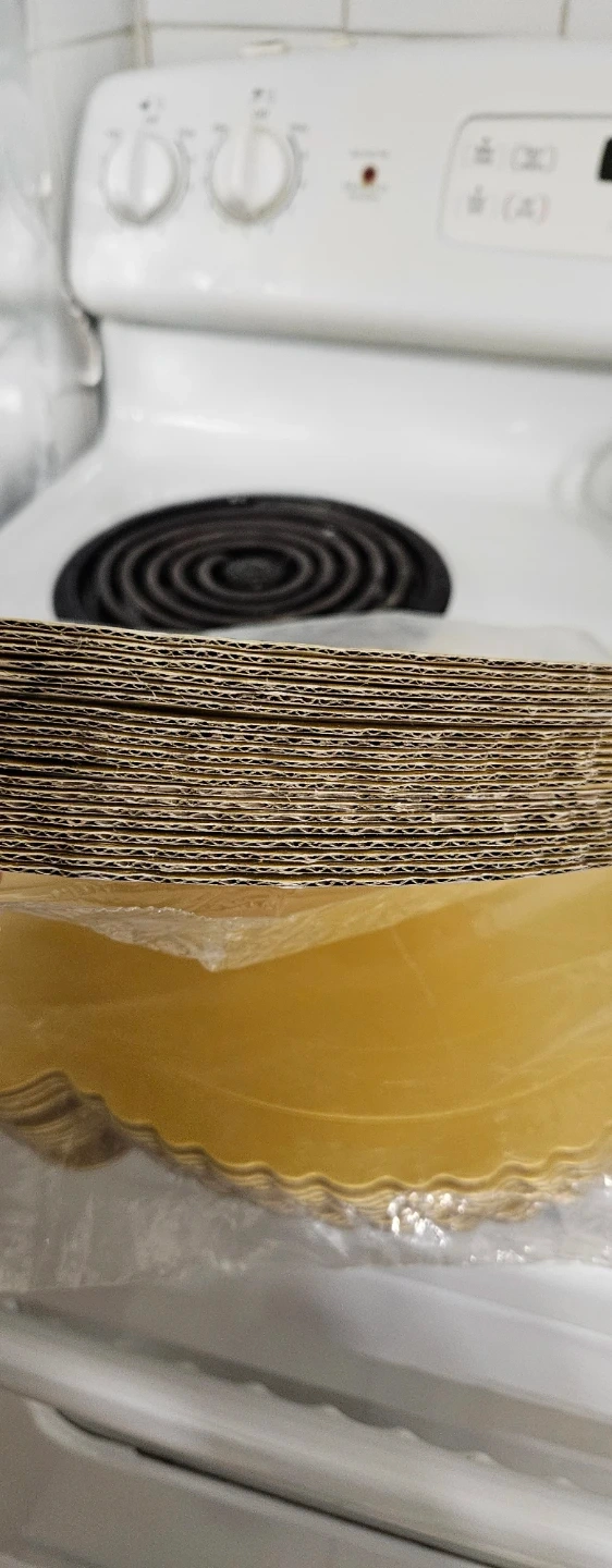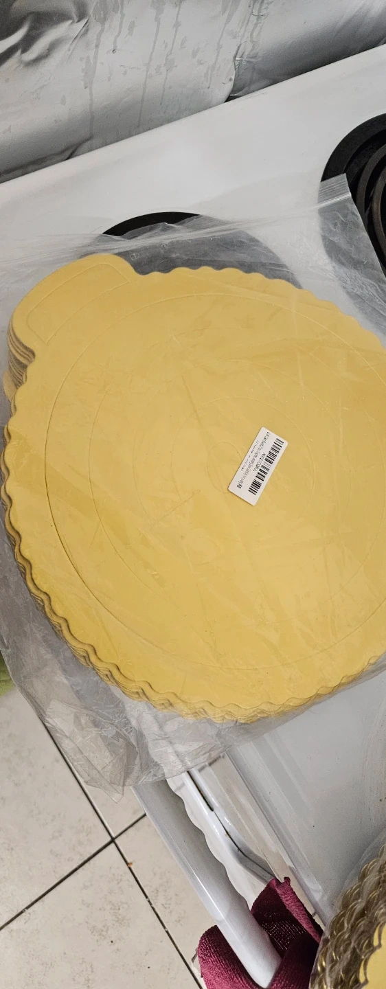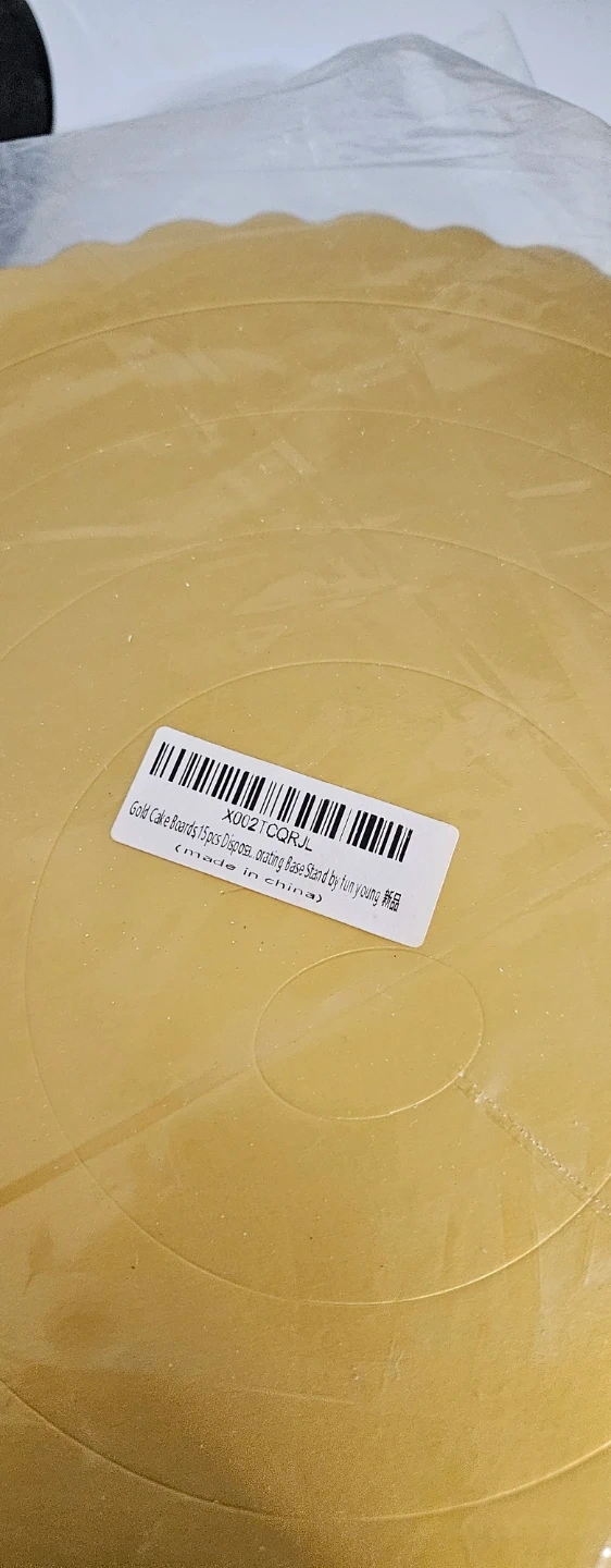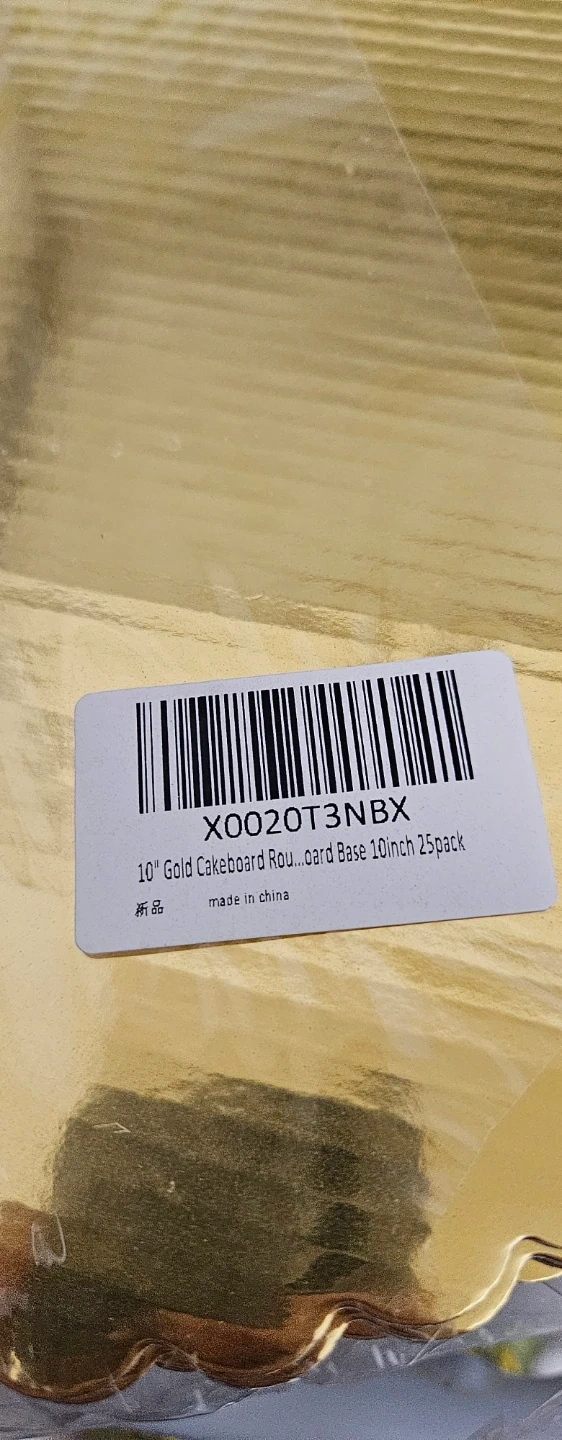 Selling a pack of 10-inch gold cakeboard rounds. This is a 25-pack, perfect for baking enthusiasts or small businesses! They're great for displaying your cakes and adding a touch of elegance to your creations