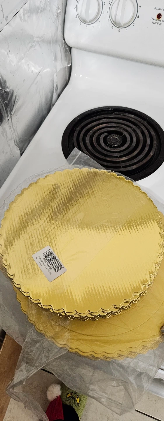 Selling a pack of 10-inch gold cakeboard rounds. This is a 25-pack, perfect for baking enthusiasts or small businesses! They're great for displaying your cakes and adding a touch of elegance to your creations