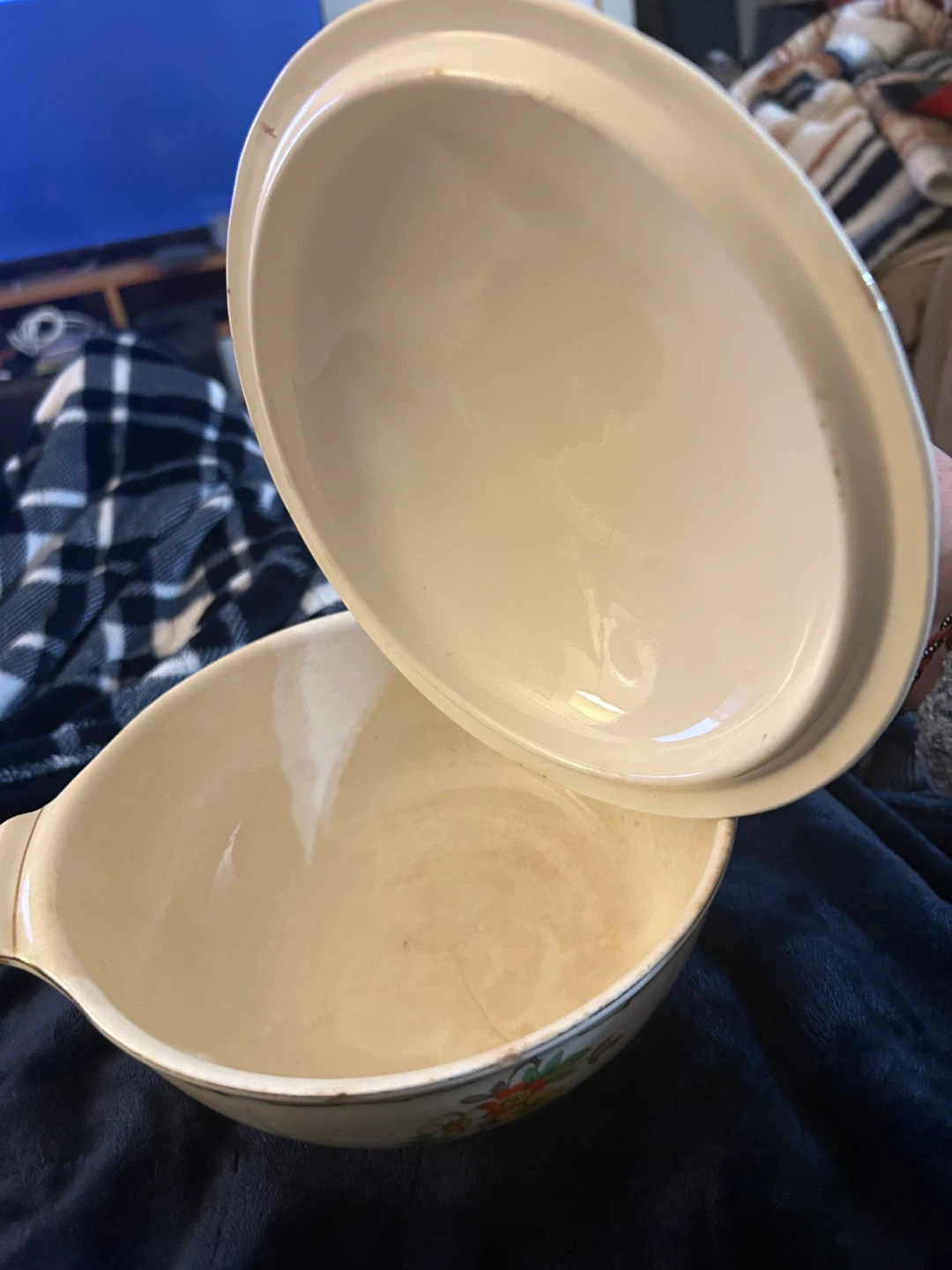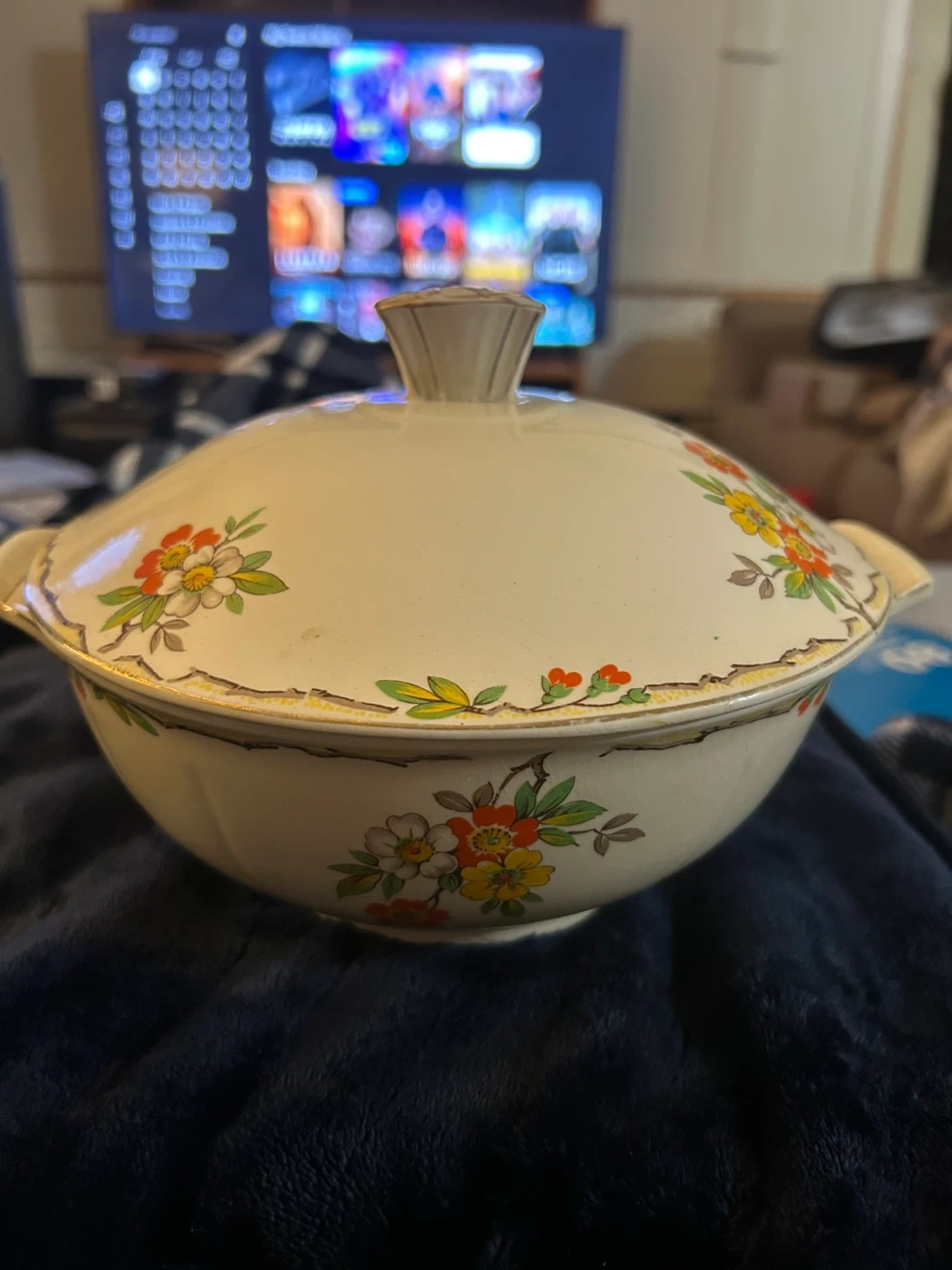 A lovely vintage casserole dish with a decorative floral pattern. It has handles on the sides and a matching lid. The inside shows some signs of use, but it's still a charming piece for serving.