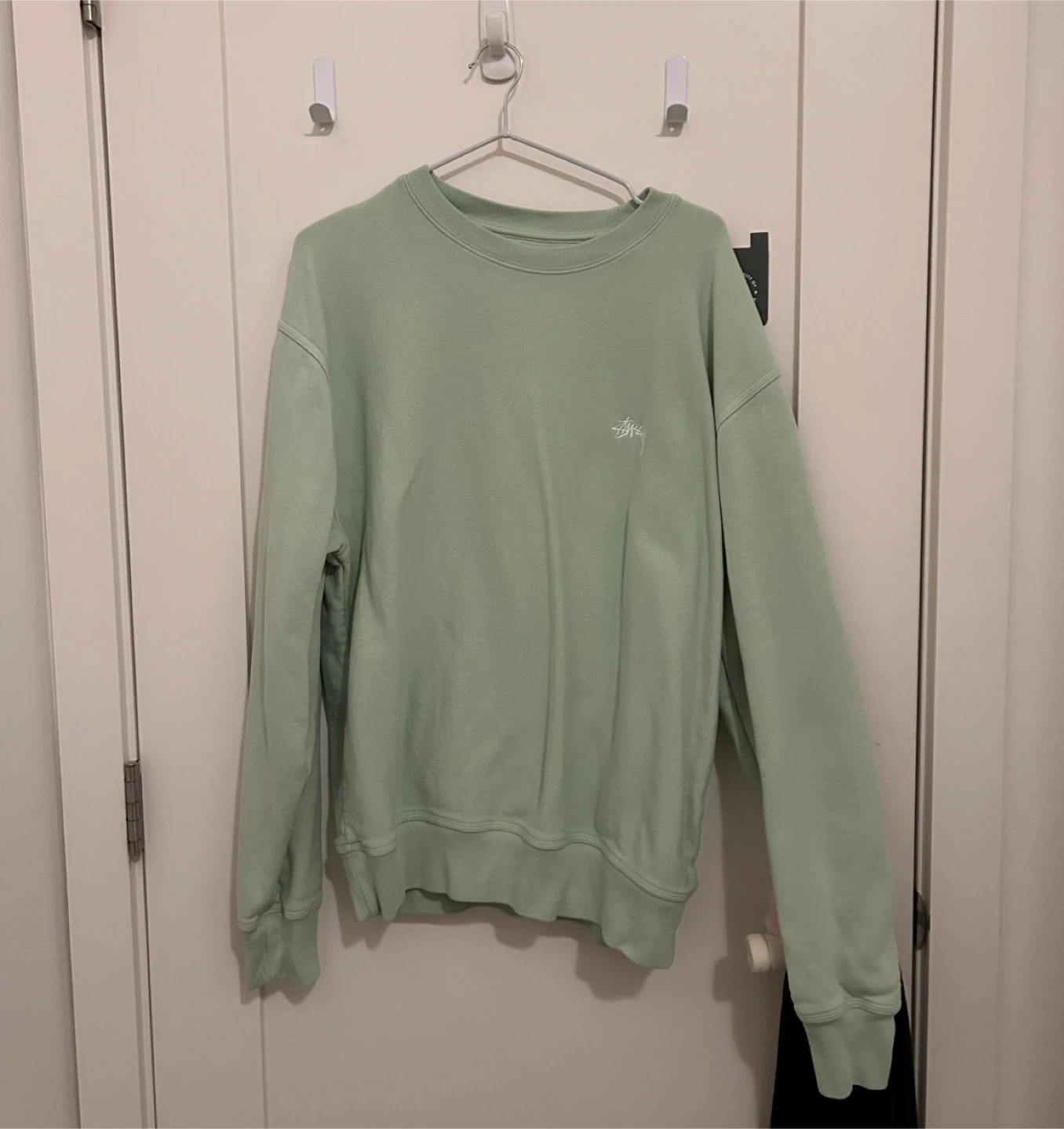 This is a Stüssy crewneck sweatshirt in a light green colour. It's a size medium and made in Vietnam. It's a comfy sweater for casual wear. (Oversized)