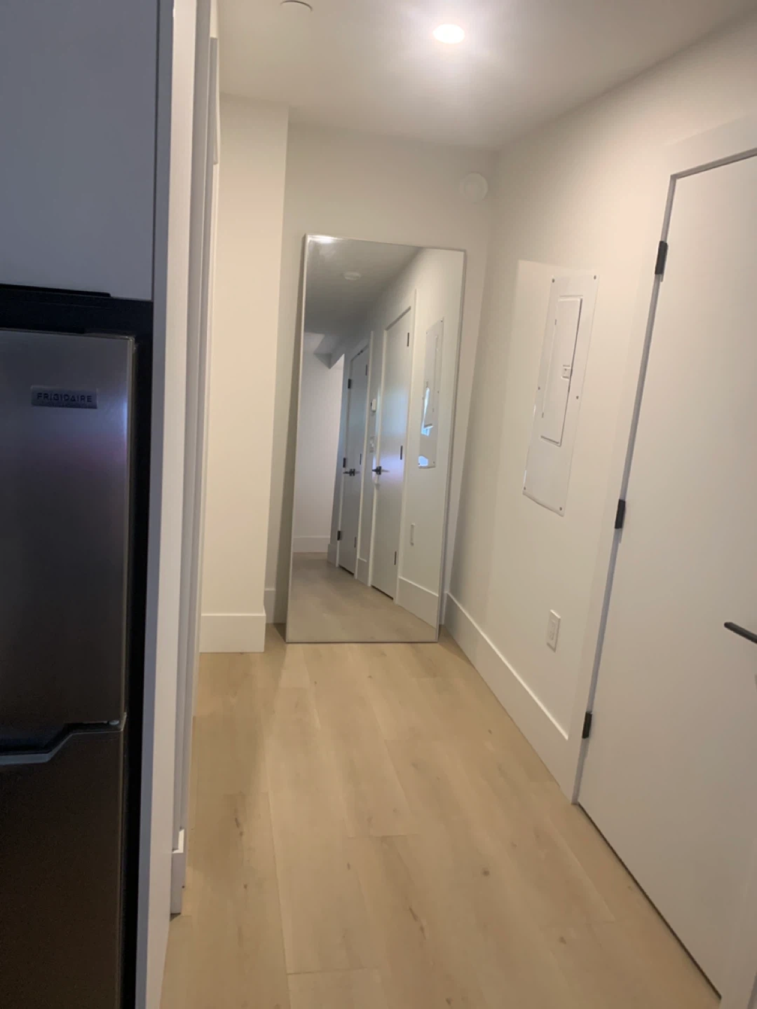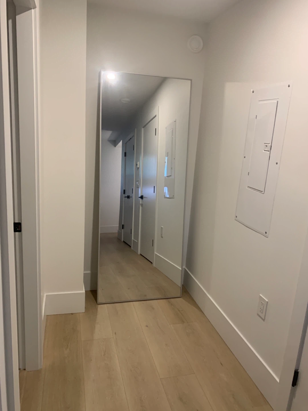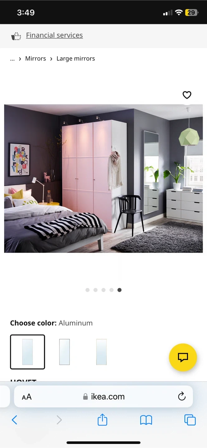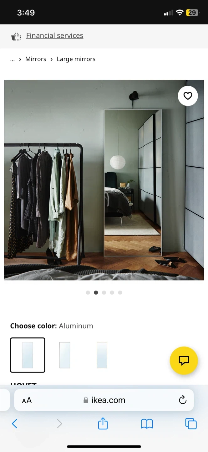 This is a very large/tall, IKEA HOVET full-length mirror with a simple silver frame. It's perfect for checking your outfit. It would be useful in a bedroom, hallway, or entryway.