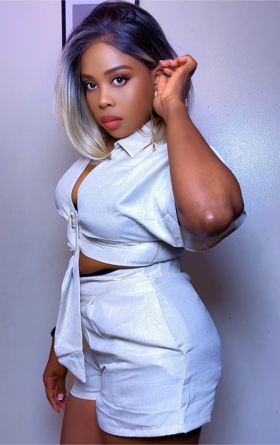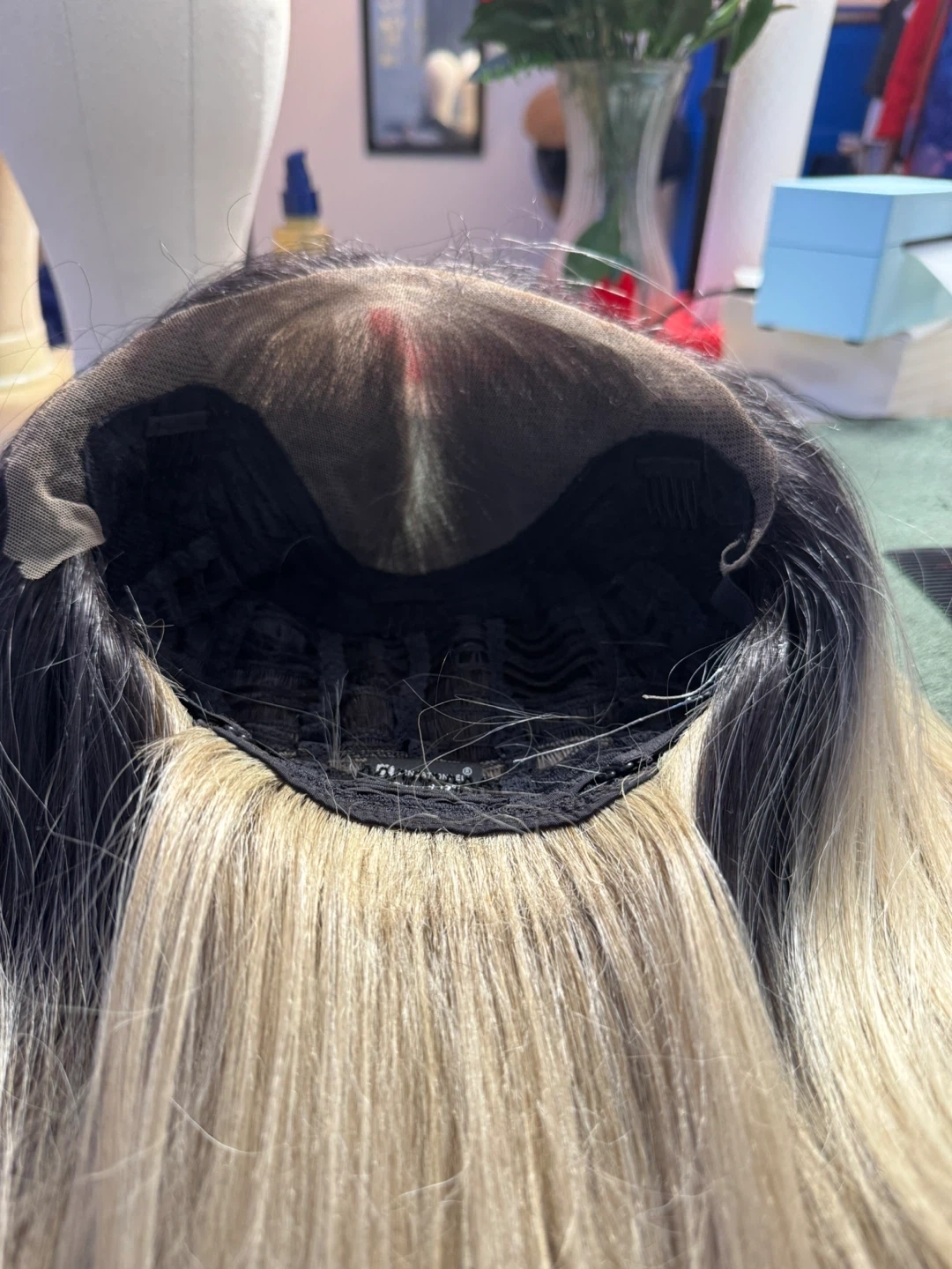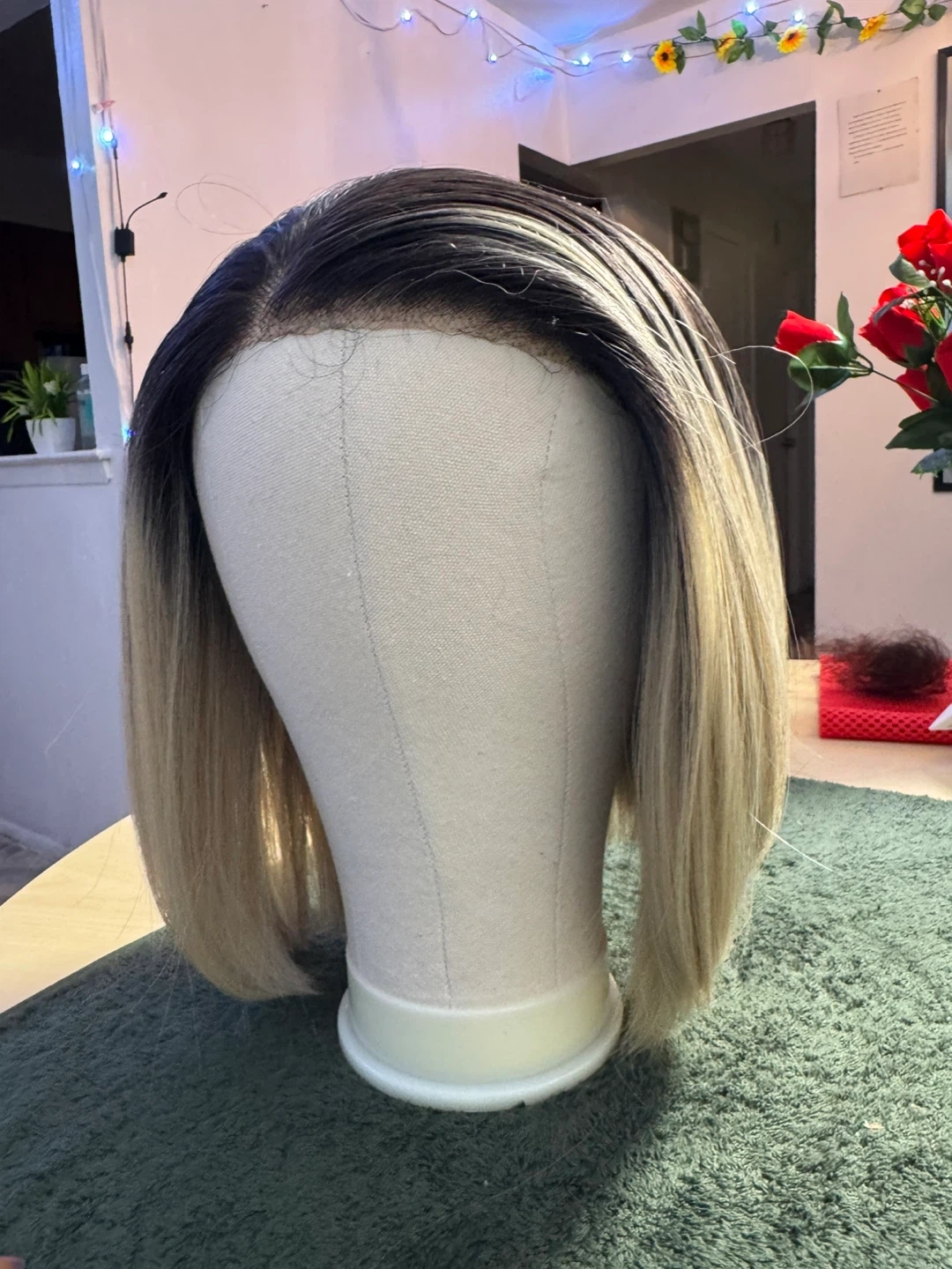 This is a stylish ombre blonde bob wig with dark roots. It's a synthetic wig, cut to a chic bob length. Perfect for a quick style change or adding volume!
