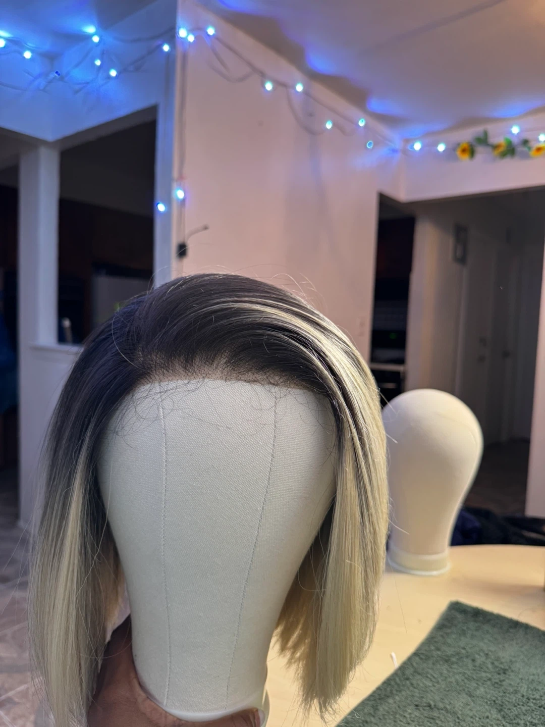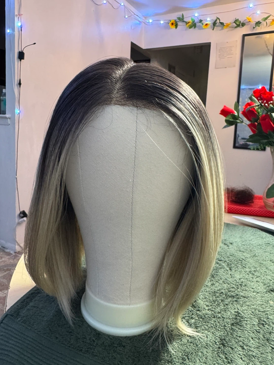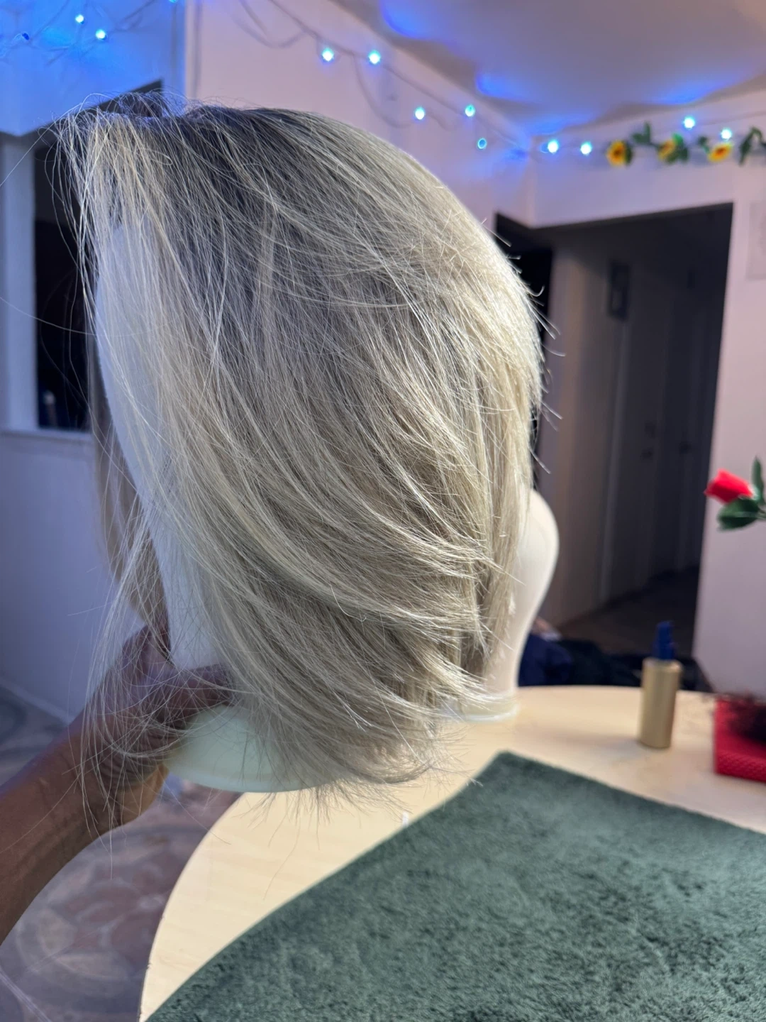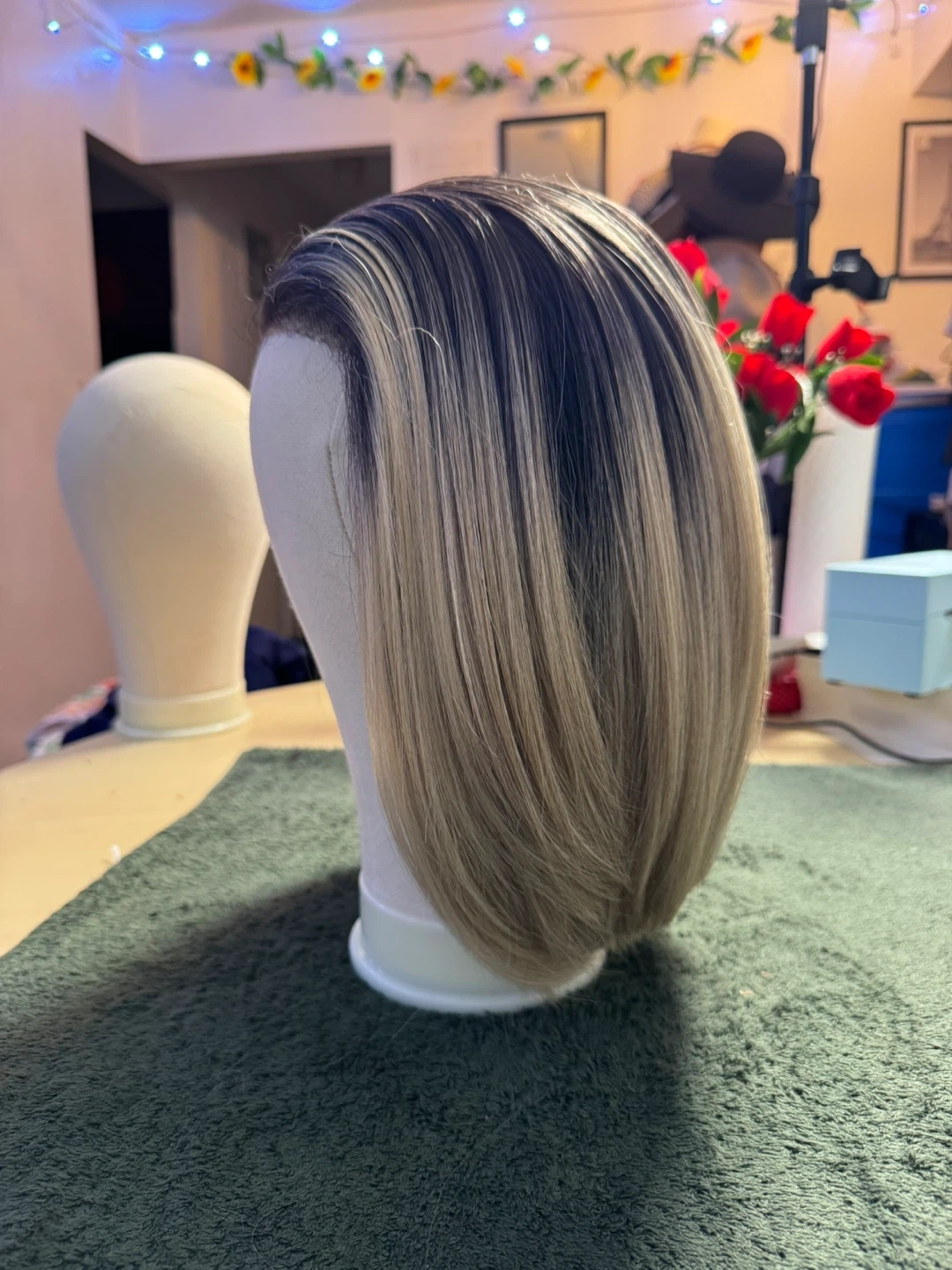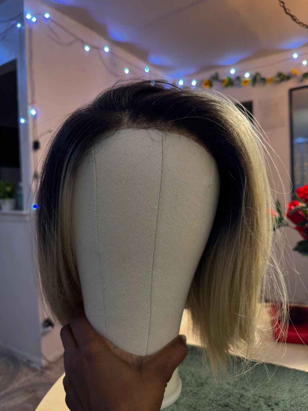 This is a stylish ombre blonde bob wig with dark roots. It's a synthetic wig, cut to a chic bob length. Perfect for a quick style change or adding volume!