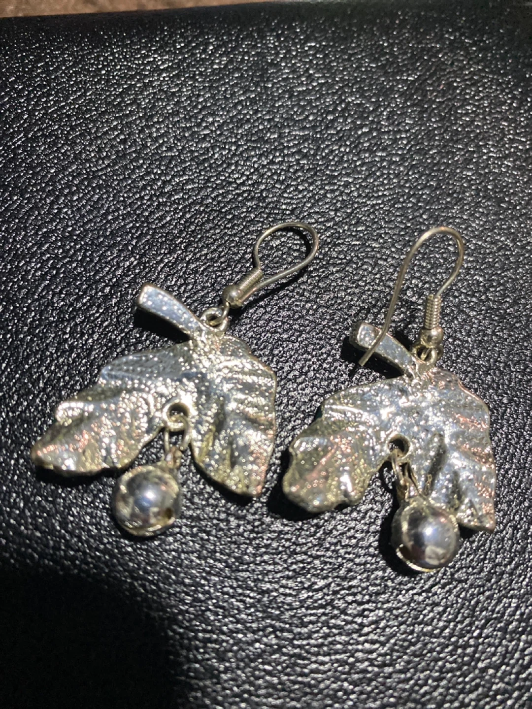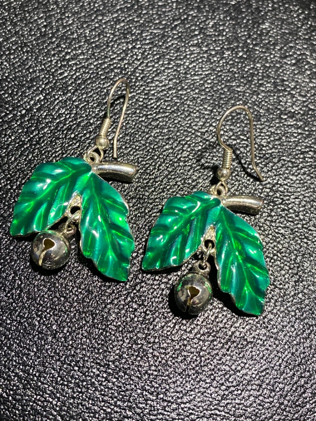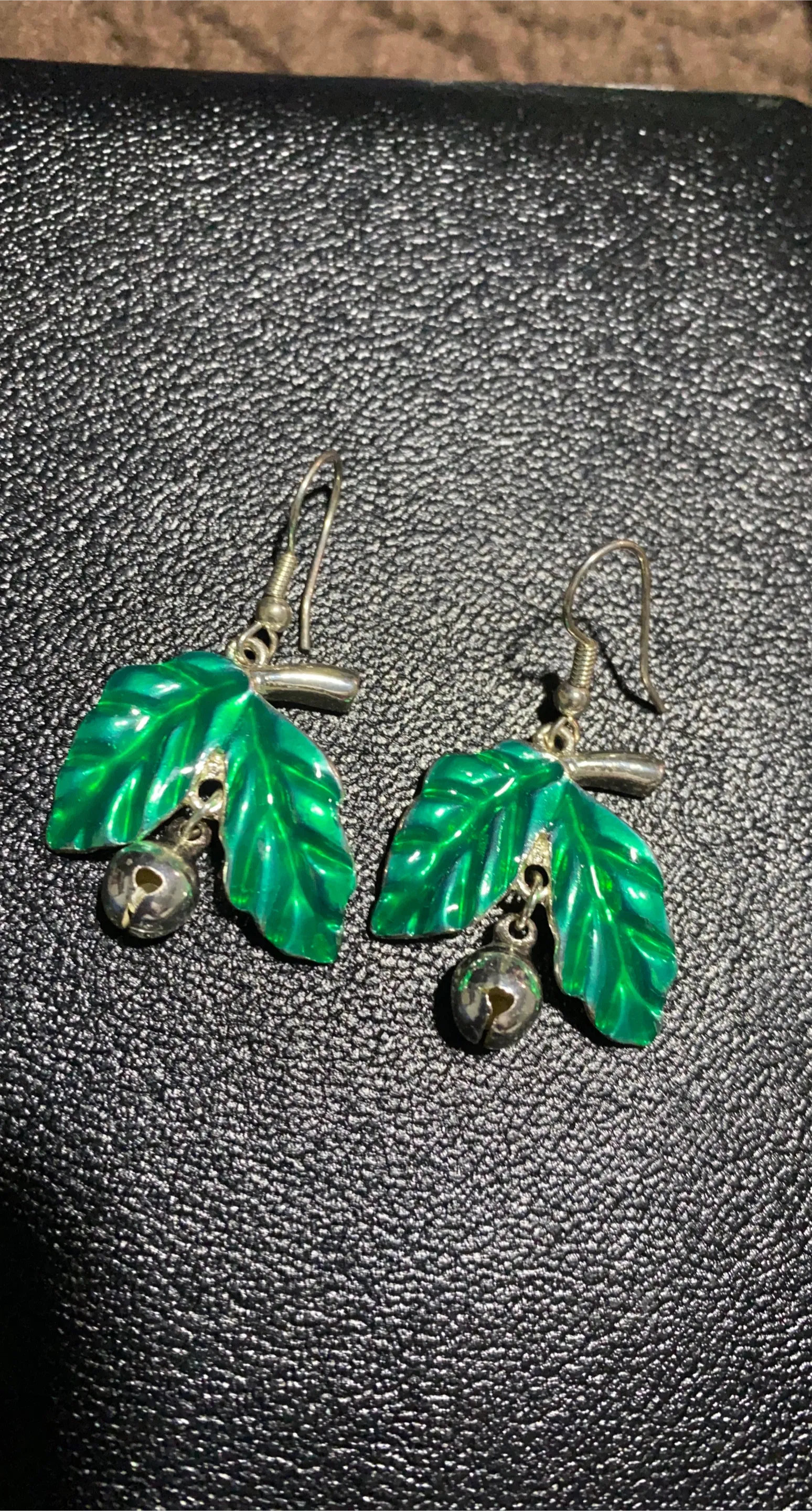 Cute green enamel leaf earrings with little silver bells. These dangly earrings feature a leaf design with a small bell dangling below. They're great for adding a playful touch to your outfit!