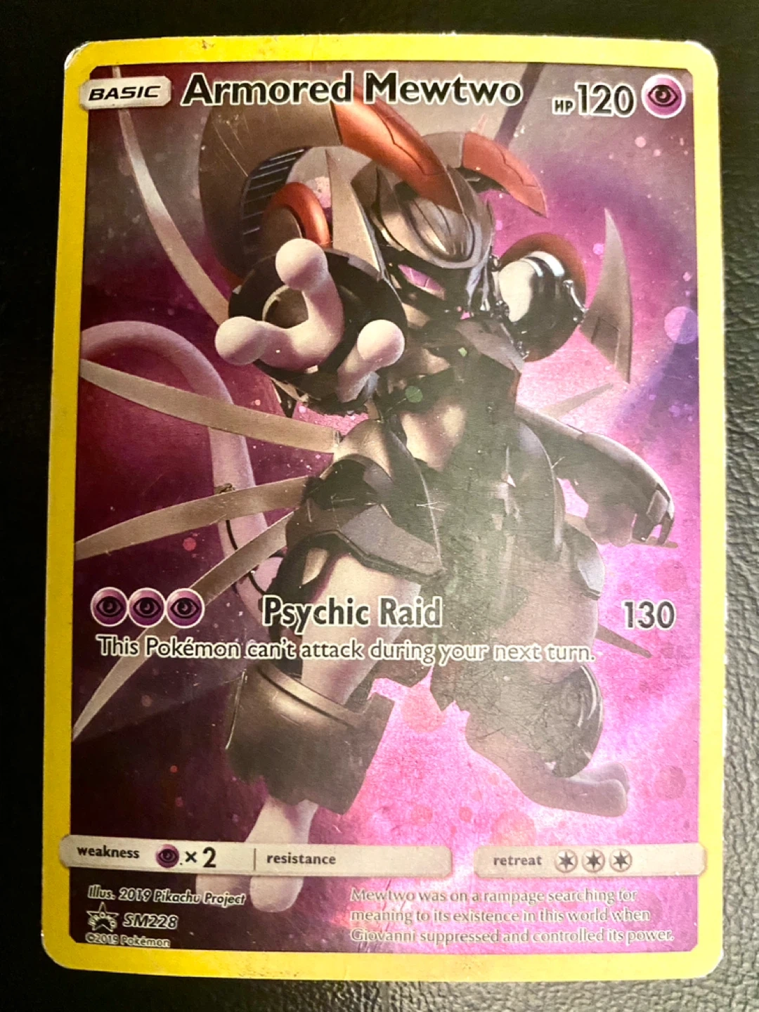 This is a 'Basic' Armored Mewtwo Pokémon trading card, card number SM228. It has 120 HP and an attack called 'Psychic Raid' that deals 130 damage. Illustated by Pikachu Project in 2019. This card has heavy played/damage.