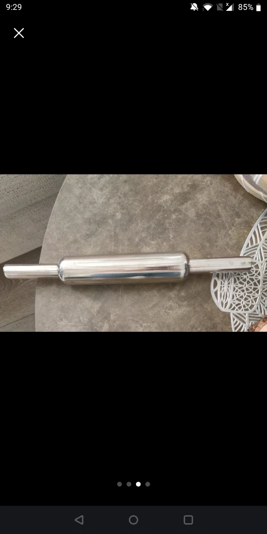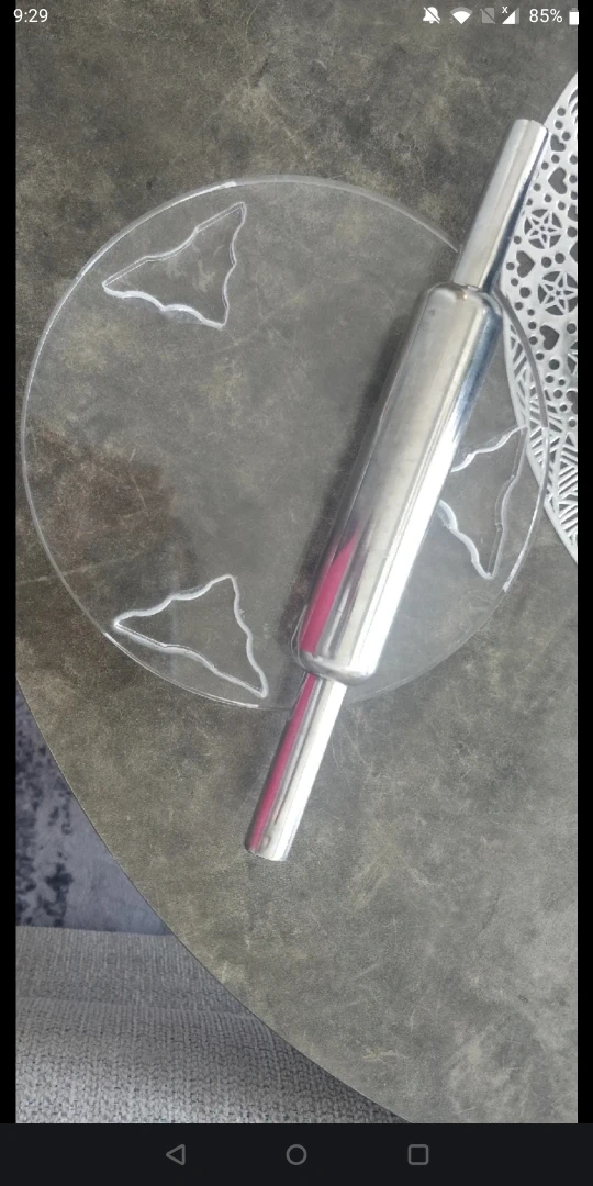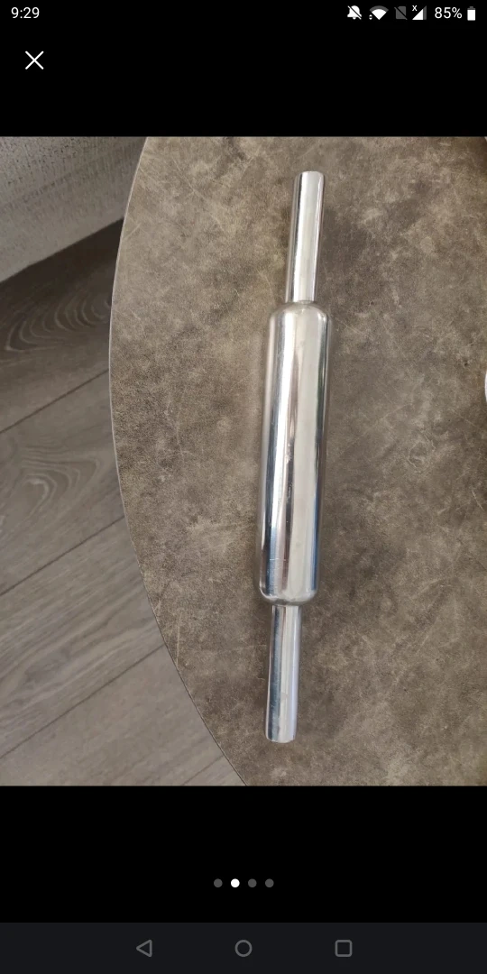 It's a stainless steel rolling pin with a clear acrylic stand. The stand is 9 inches in diameter and 0.5 inches thick. Great for baking pastries and dough!