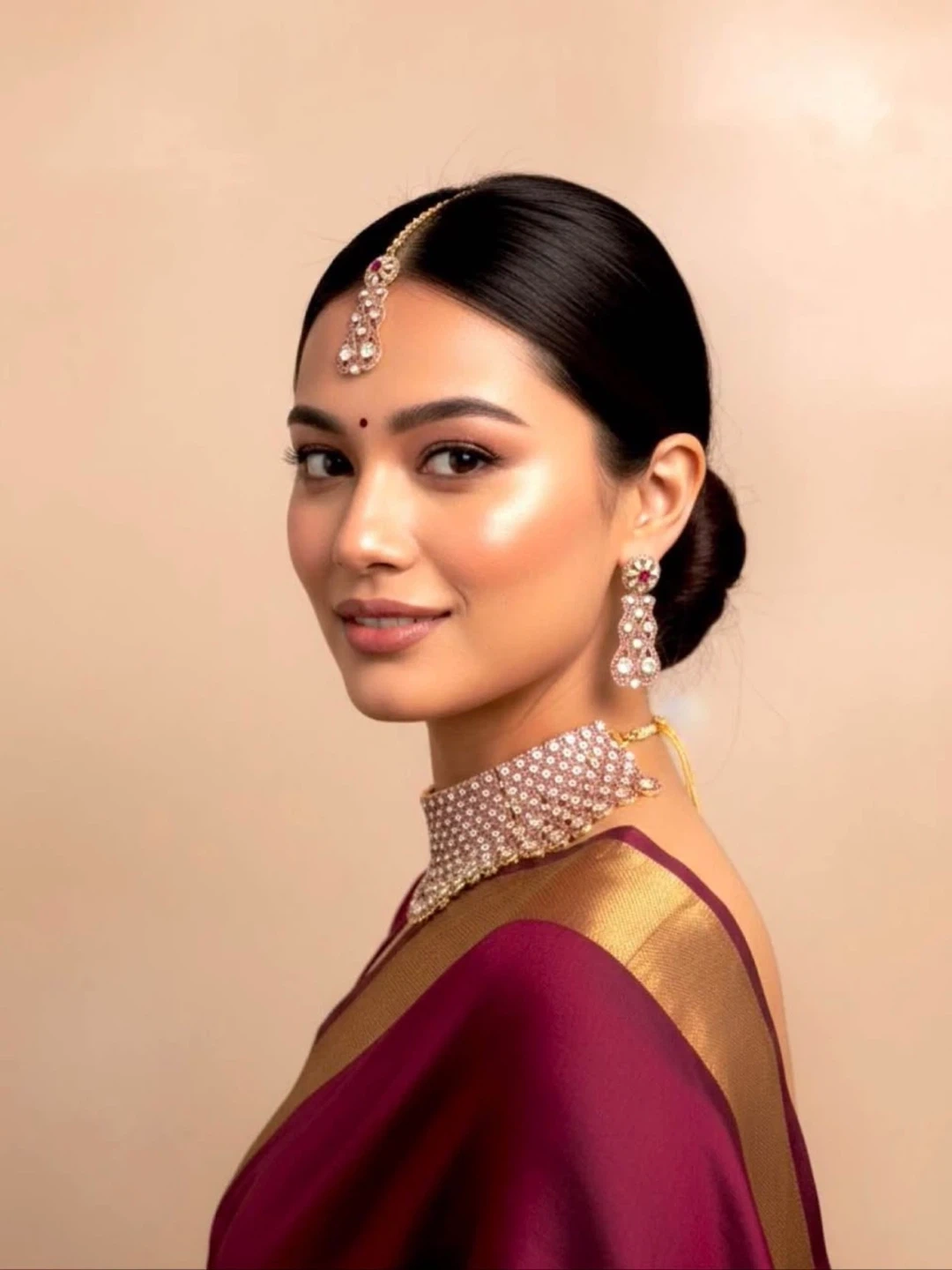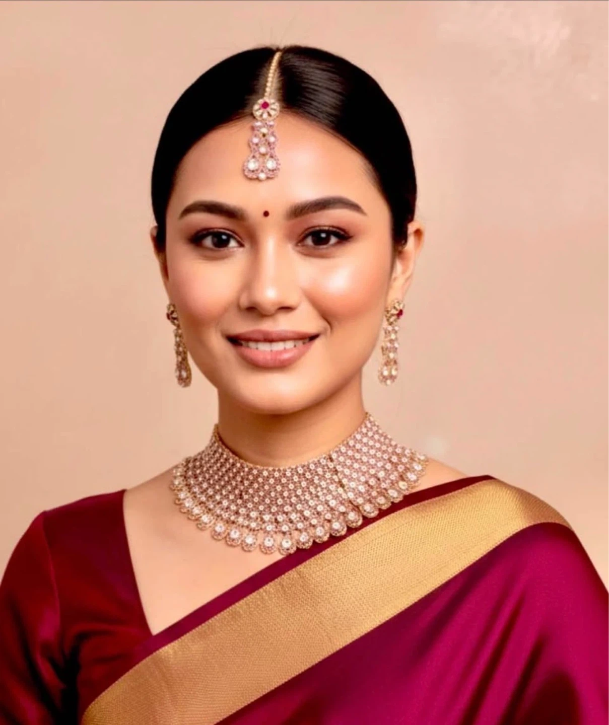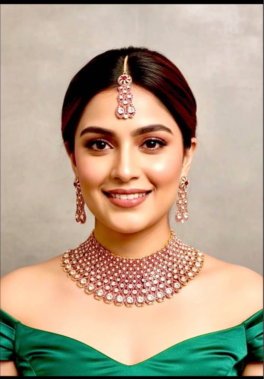 Beautiful bridal jewellery set featuring a statement necklace, matching drop earrings, and a tikka. Intricately designed with sparkling stones. Perfect for special occasions and cultural events!