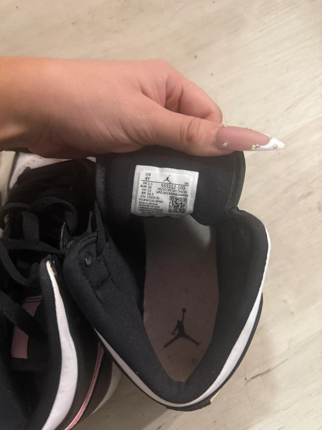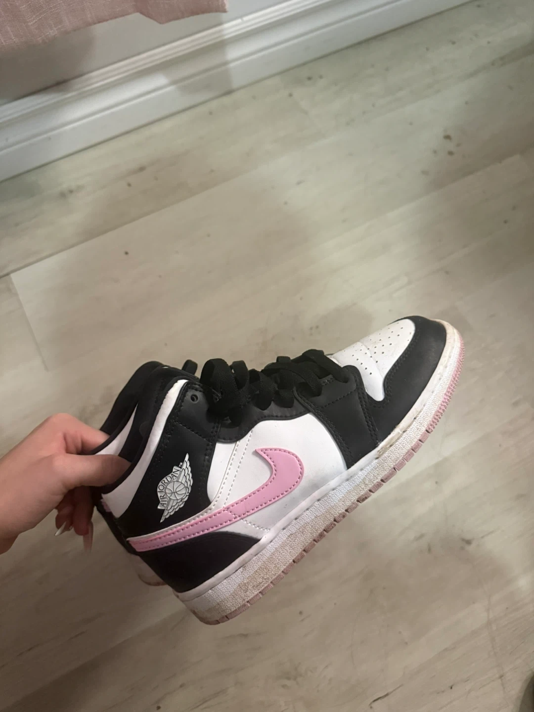 Gently used pair of Air Jordan 1 Mids. Still in great condition clean uppers, no rips or tears, just light wear on the soles. Super cute colorway with the pink swoosh, easy to style. Always kept clean and stored properly. no box