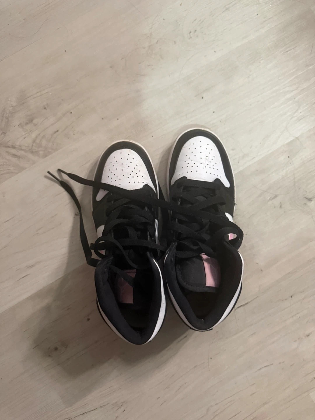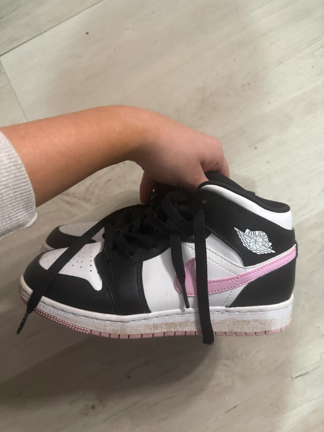 Gently used pair of Air Jordan 1 Mids. Still in great condition clean uppers, no rips or tears, just light wear on the soles. Super cute colorway with the pink swoosh, easy to style. Always kept clean and stored properly. no box