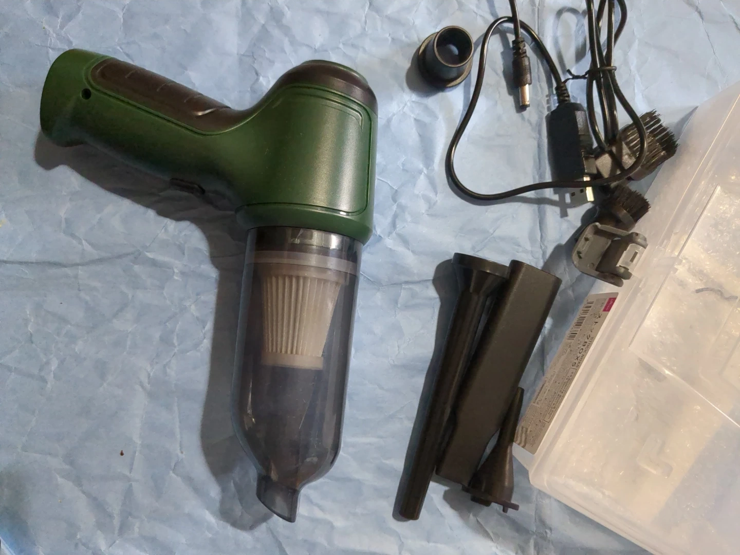 This 3-in-1 vacuum cleaner is green and comes with multiple attachments and a charging cable. It features a removable dustbin and filter. It's portable and easy to use for quick cleanups!