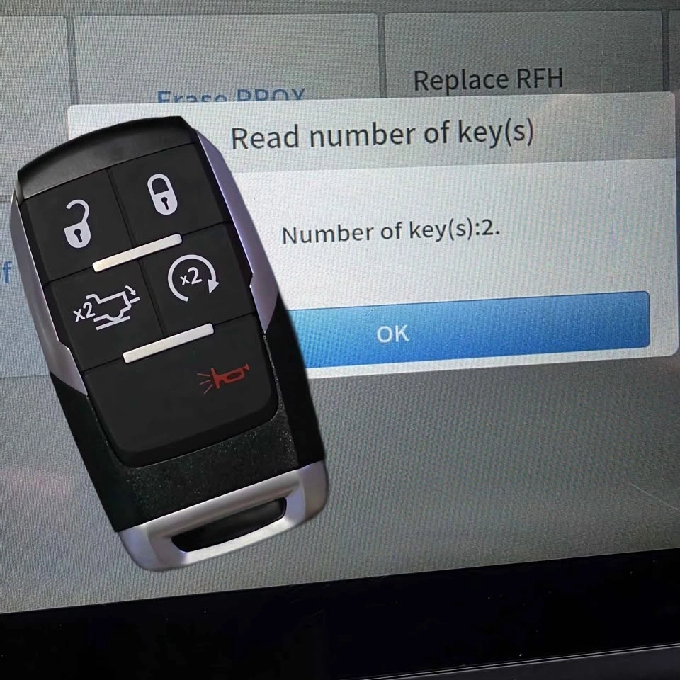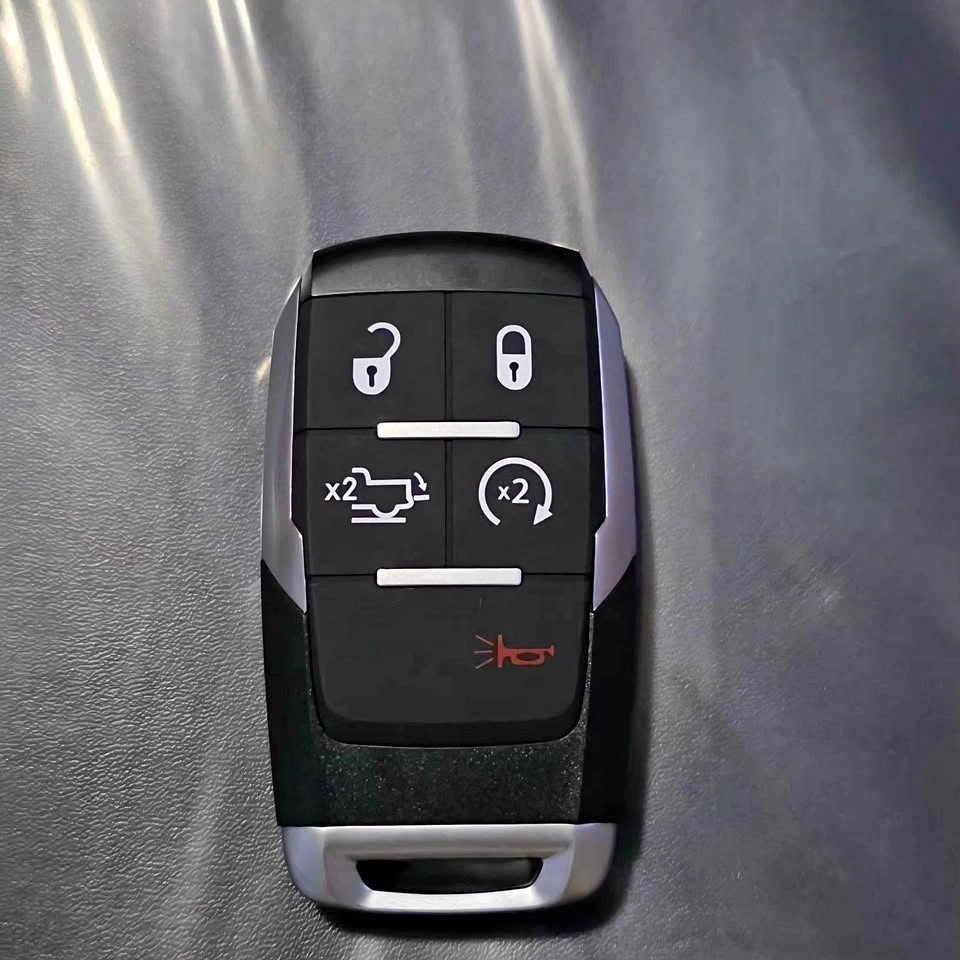 New 5-button smart remote key compatible with select RAM trucks. Sleek design, responsive buttons, and ready for use with your vehicle.
