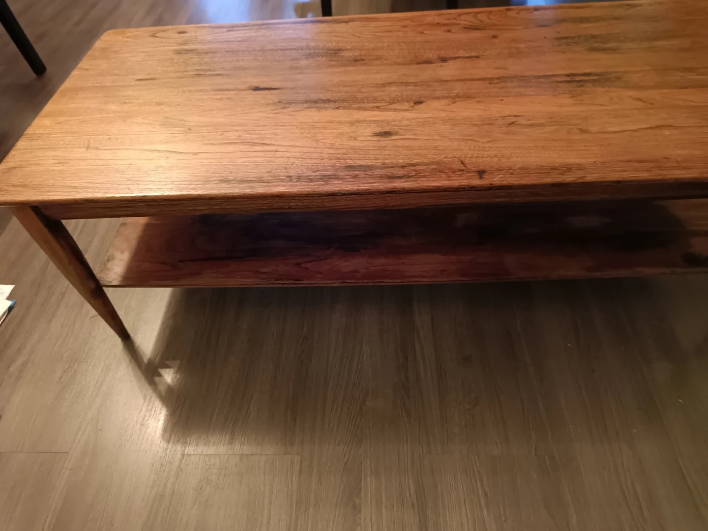 Selling a used wooden coffee table. It has a shelf underneath for extra storage or decor. It's a great piece for any living room!