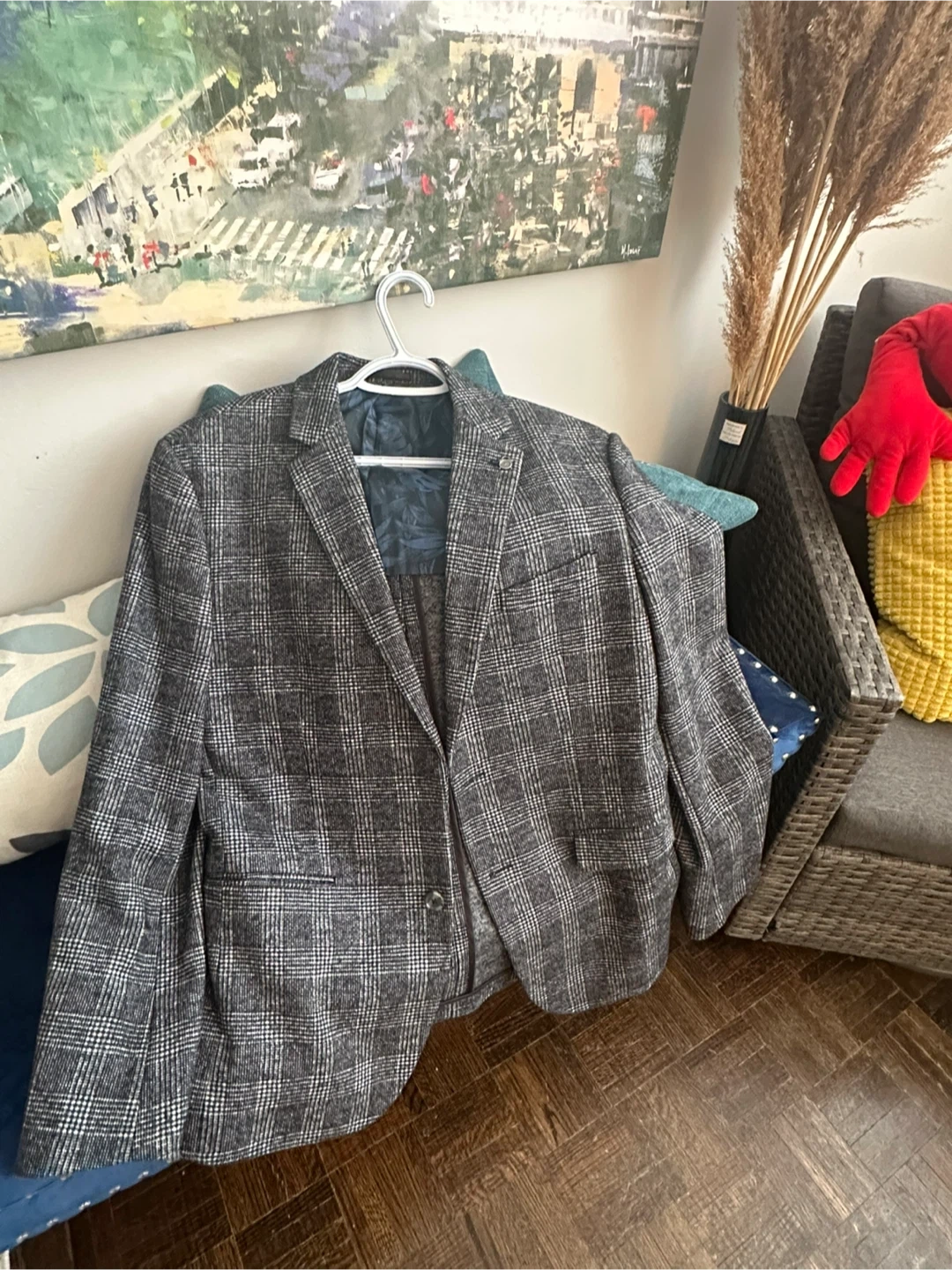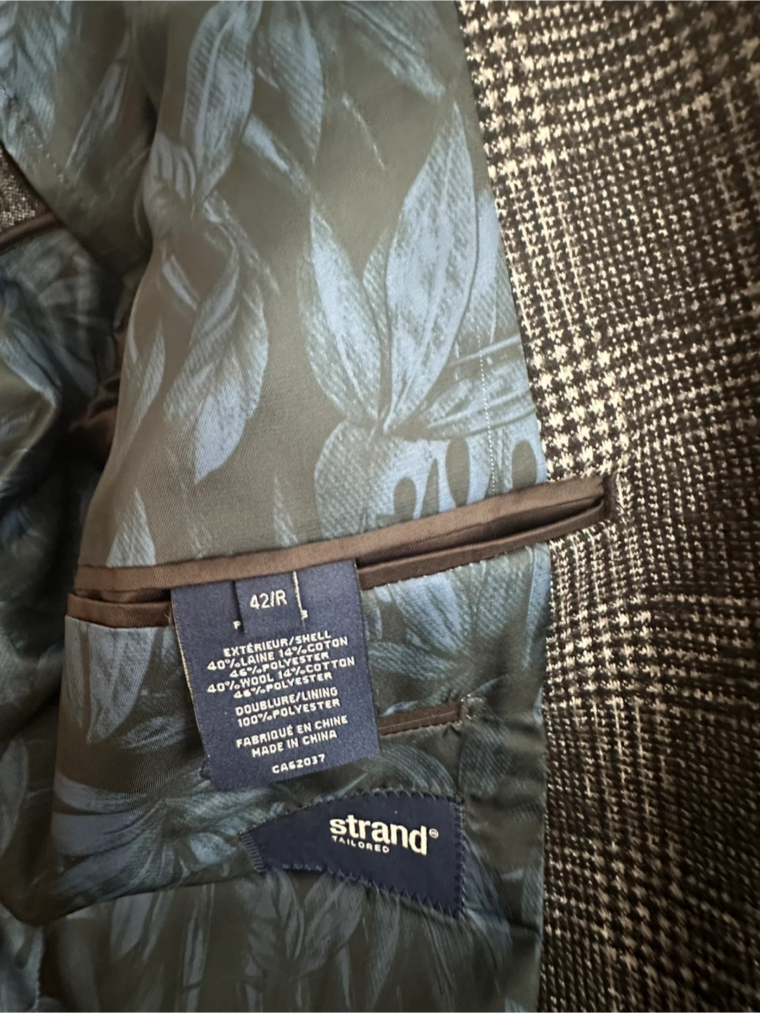 This Strand Tailored blazer features a classic plaid pattern. It's made with a blend of wool and polyester for durability and comfort. The lining is 100% polyester. This jacket is size 42R.