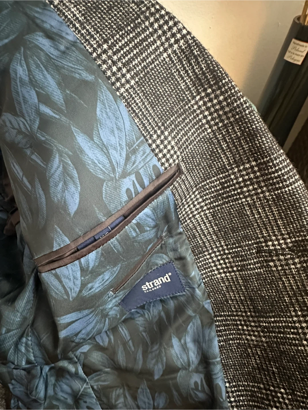 This Strand Tailored blazer features a classic plaid pattern. It's made with a blend of wool and polyester for durability and comfort. The lining is 100% polyester. This jacket is size 42R.