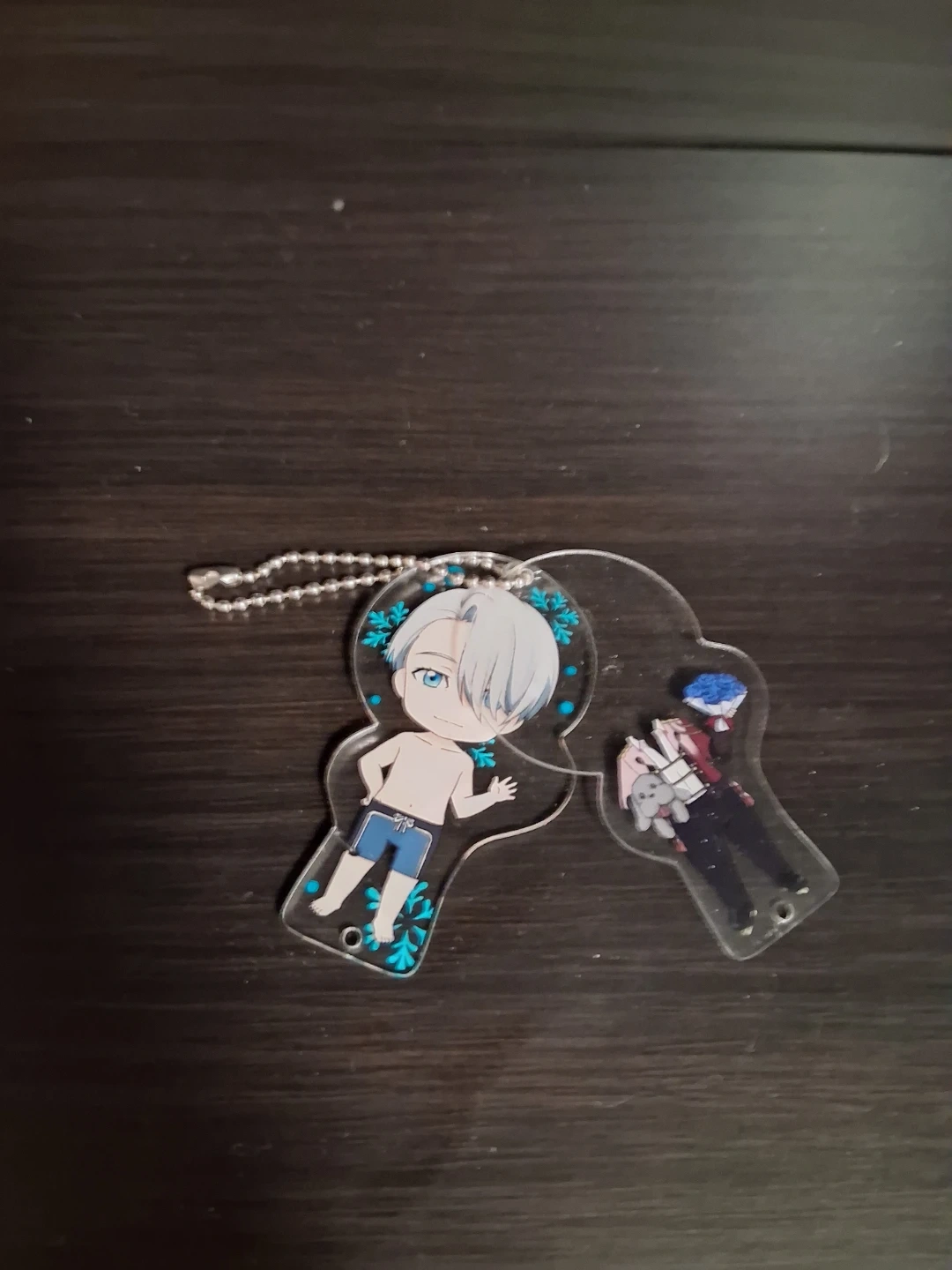 These are acrylic keychains featuring characters from the anime Yuri!!! on Ice. They're clear acrylic with printed designs. The keychains include a metal ball chain. They're a fun accessory for fans of the show!