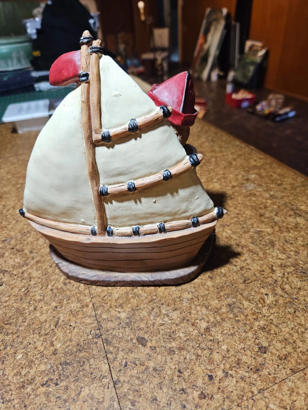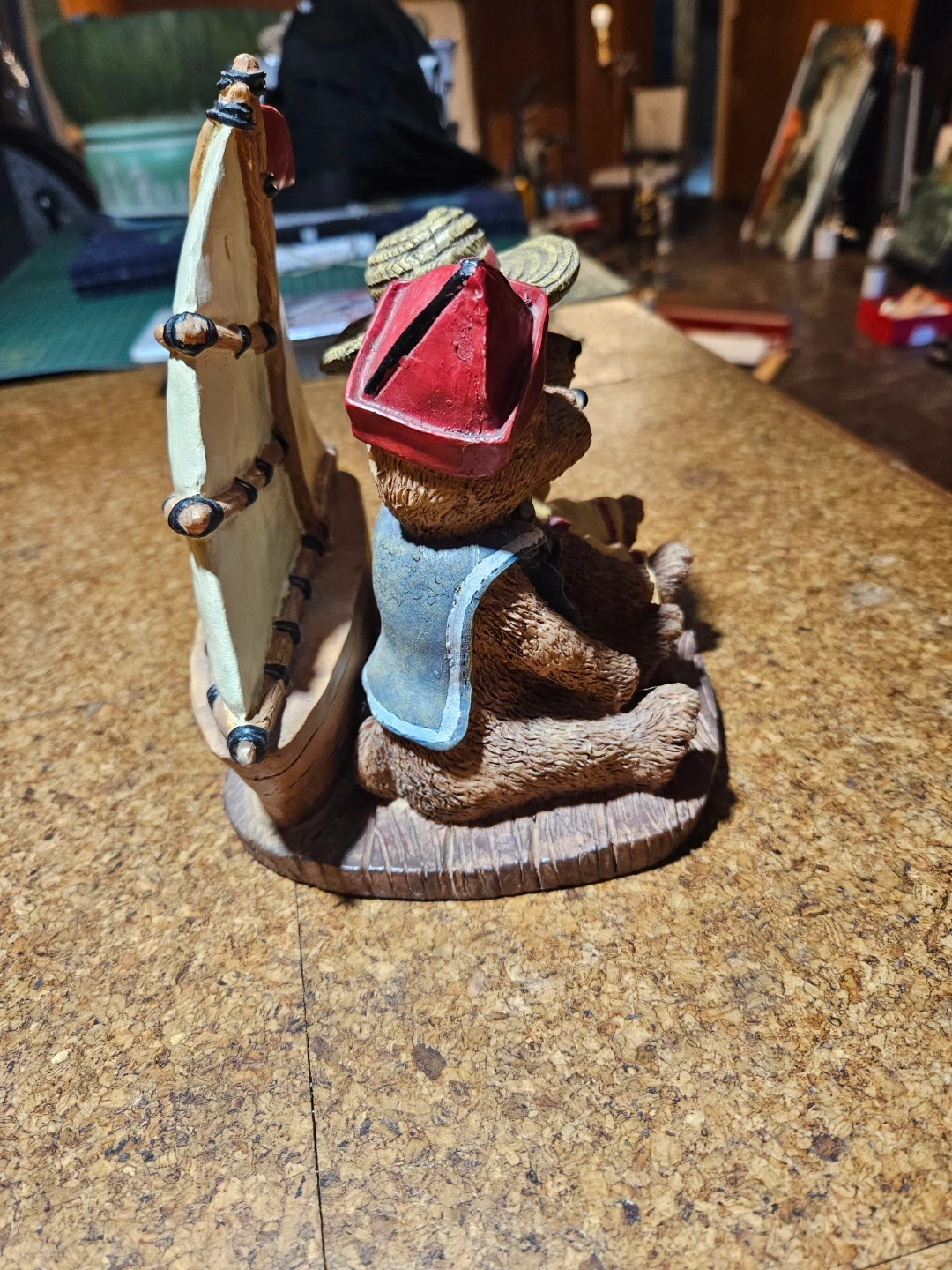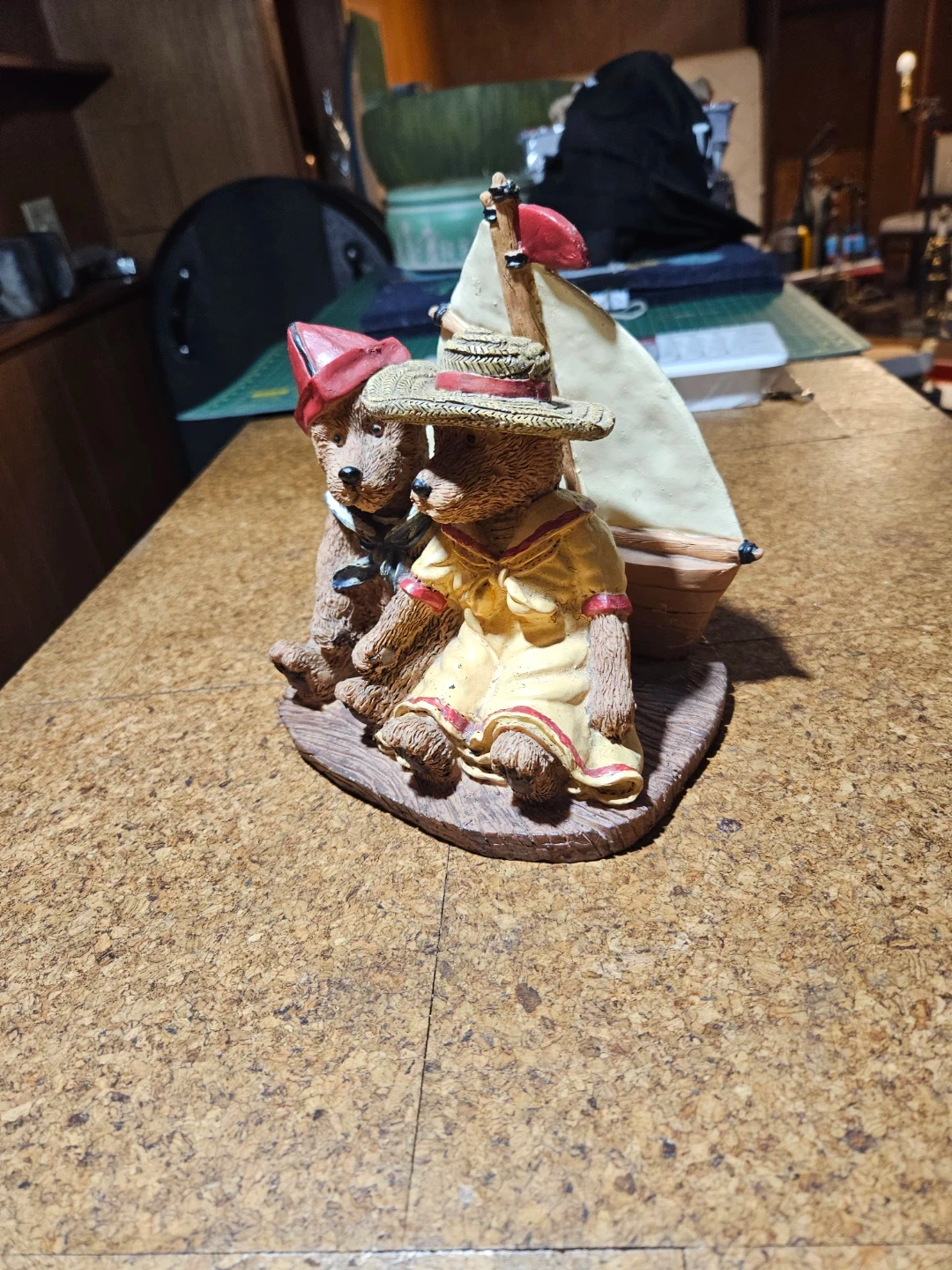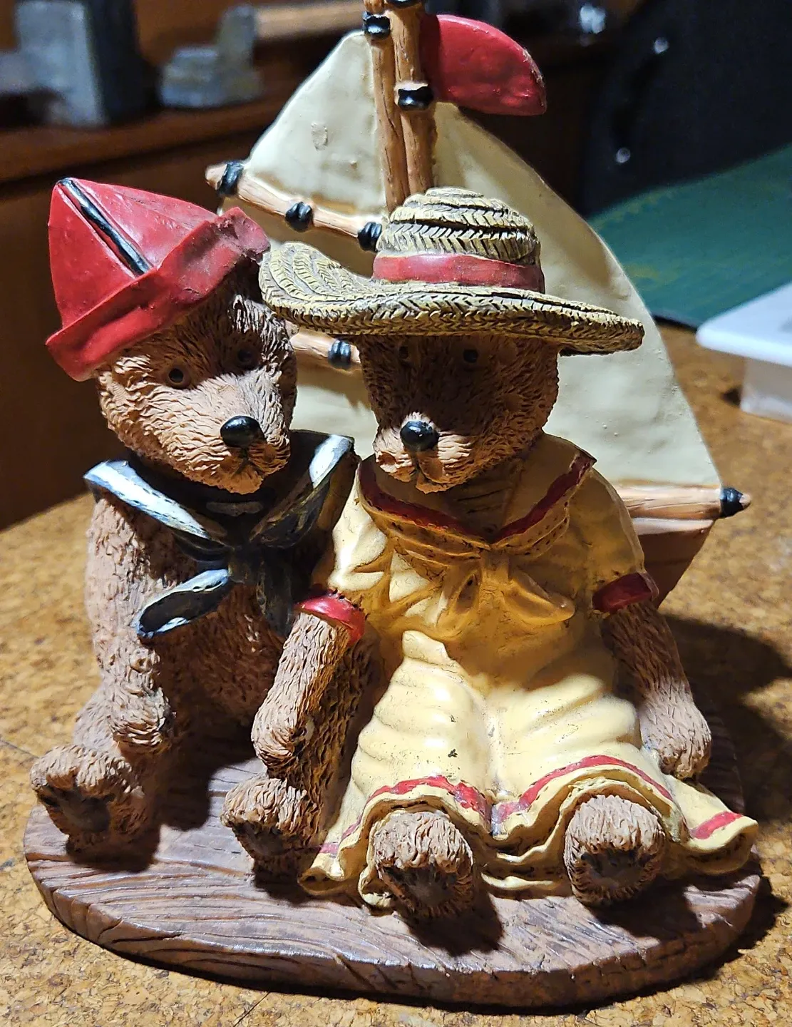 A charming figurine of two teddy bears on a sailboat. One bear wears a sailor hat and scarf, while the other wears a sun hat and a yellow dress. It's a delightful decorative piece.