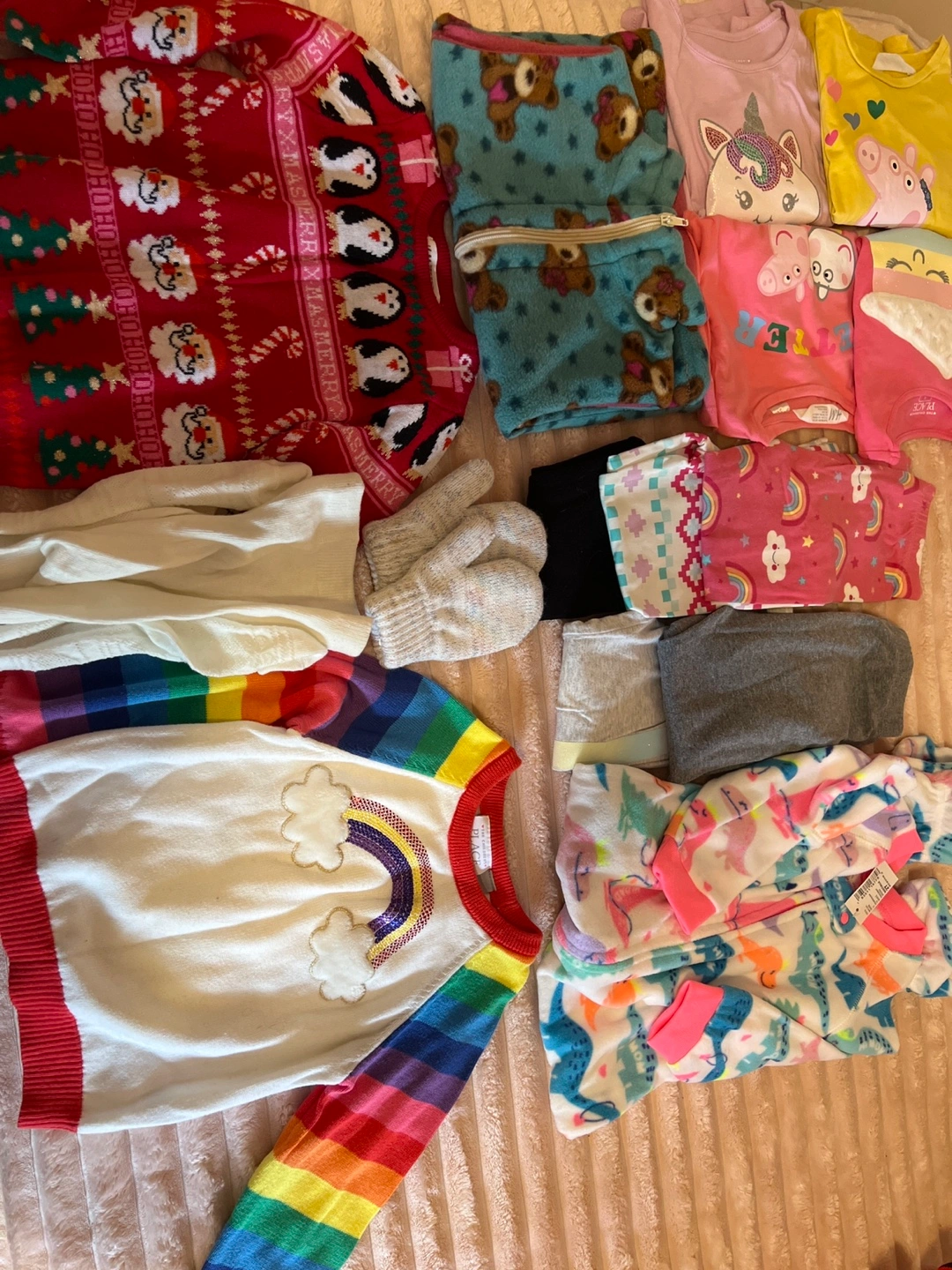 Bundle of girl's clothes in sizes 2/3 years old Includes 2 sweaters, 4 long-sleeved shirts, 5 leggings, and a zip-up vest, cozy pijamas. All are in good condition with no holes or stains.