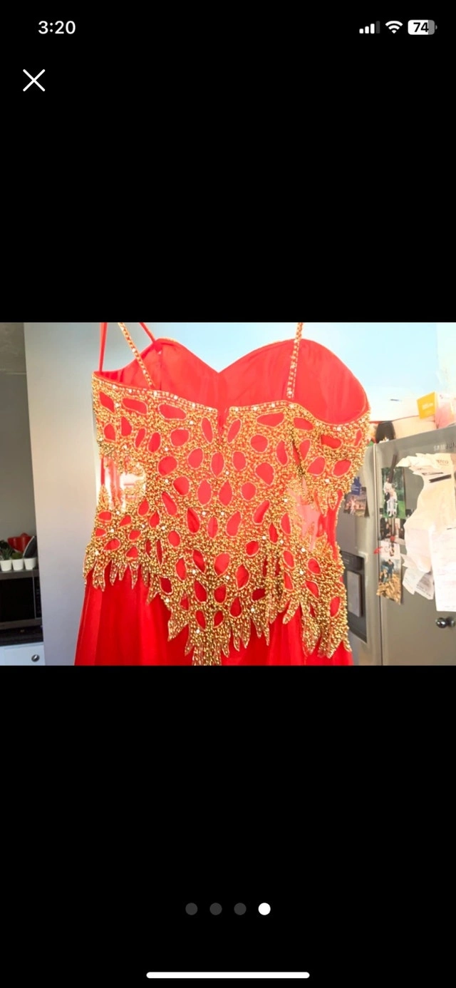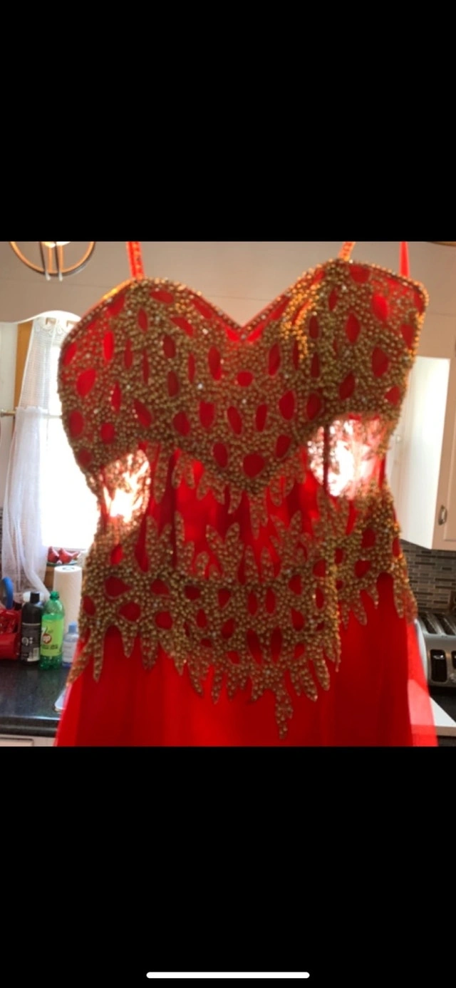This is a stunning formal gown. Full length with gold beading. Would make a perfect prom dress or a gown for any occasion. This dress is size 10. It's in like-new condition. Cash is accepted for payment. Available for curbside pickup.