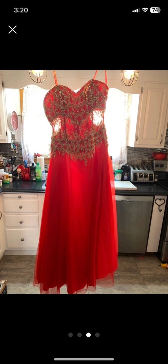 This is a stunning formal gown. Full length with gold beading. Would make a perfect prom dress or a gown for any occasion. This dress is size 10. It's in like-new condition. Cash is accepted for payment. Available for curbside pickup.