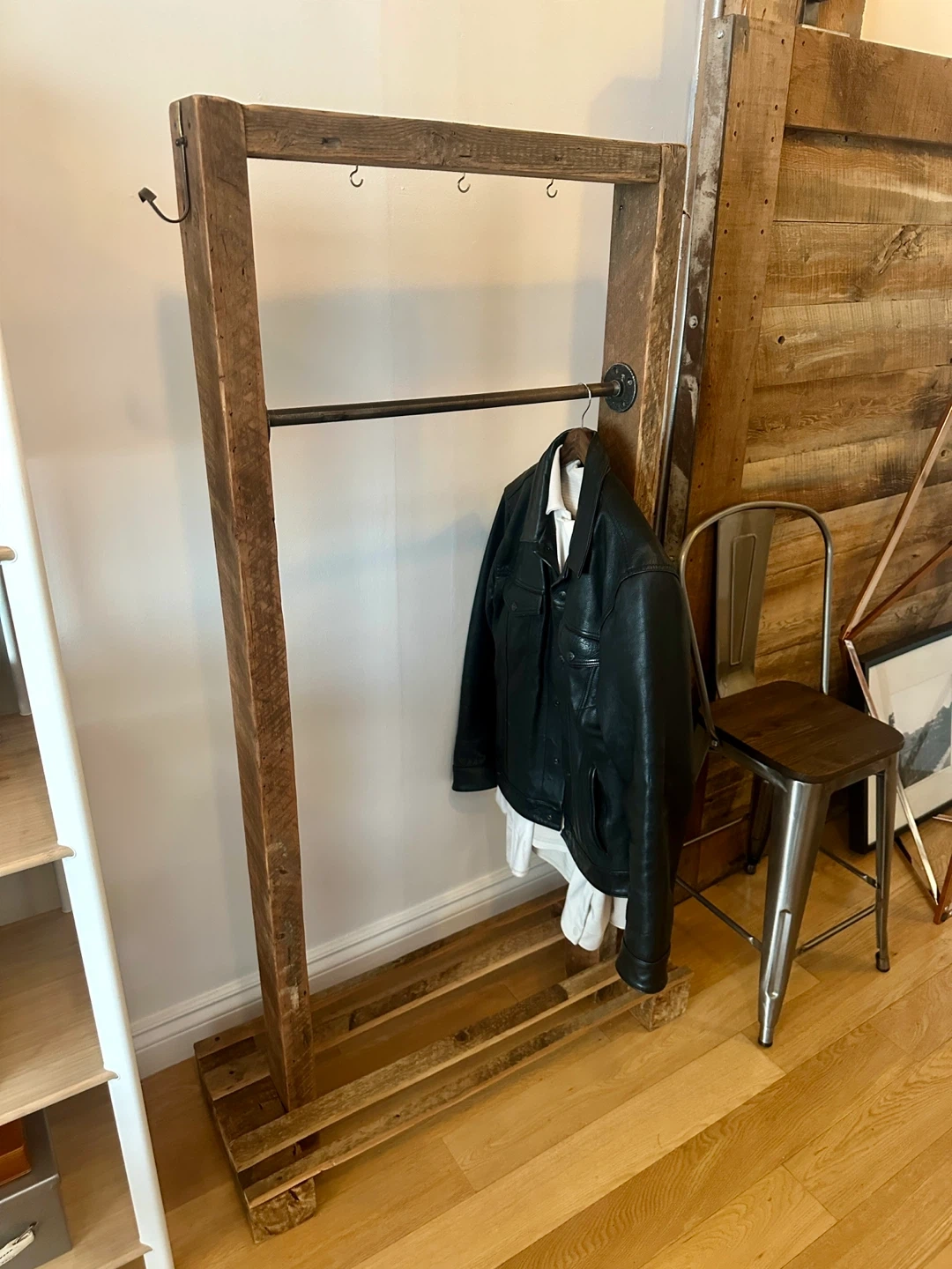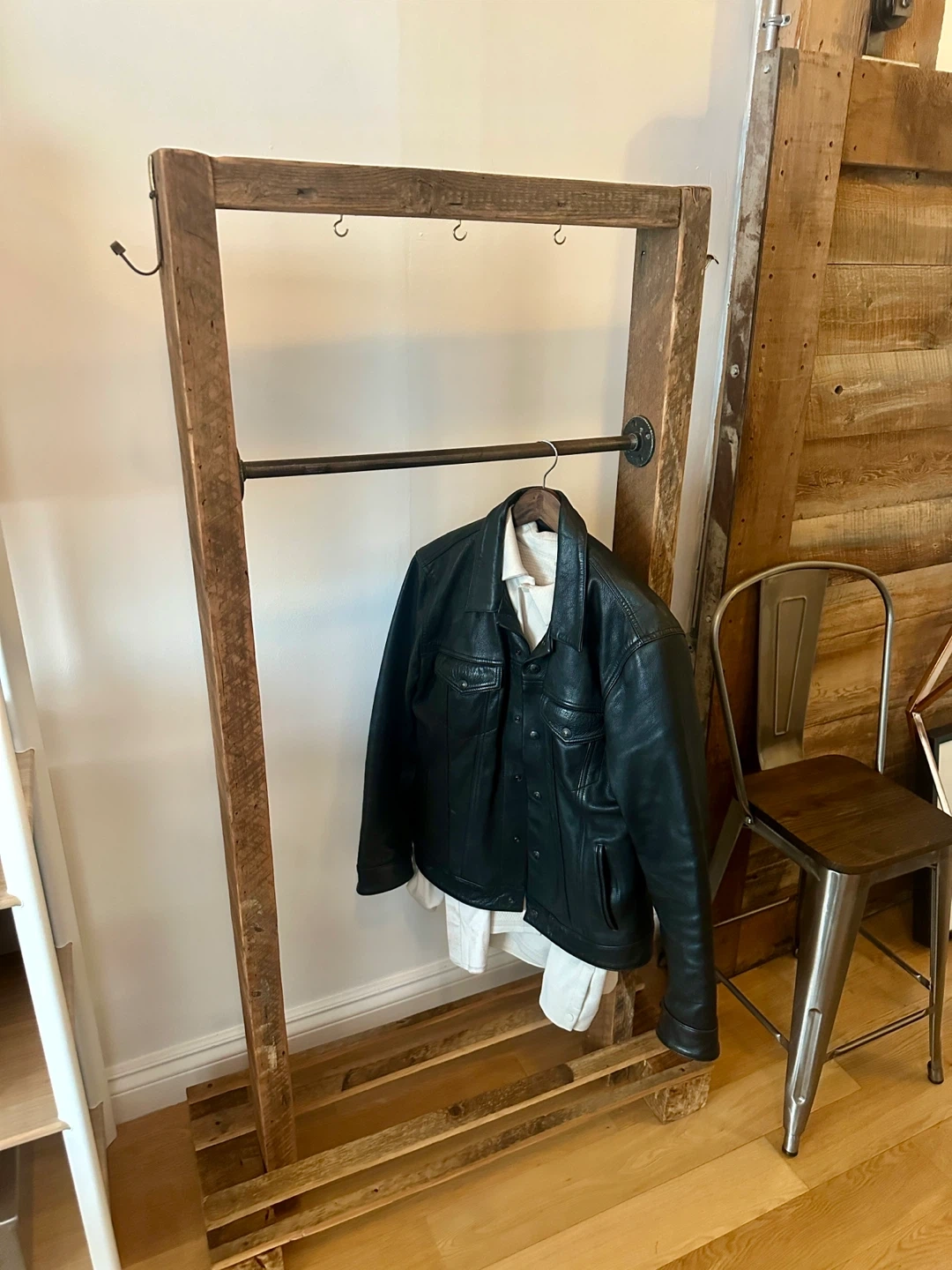 A great vintage pipe & century barn board clothing rack. Holds an amazing amount of stuff! Brass hardware.