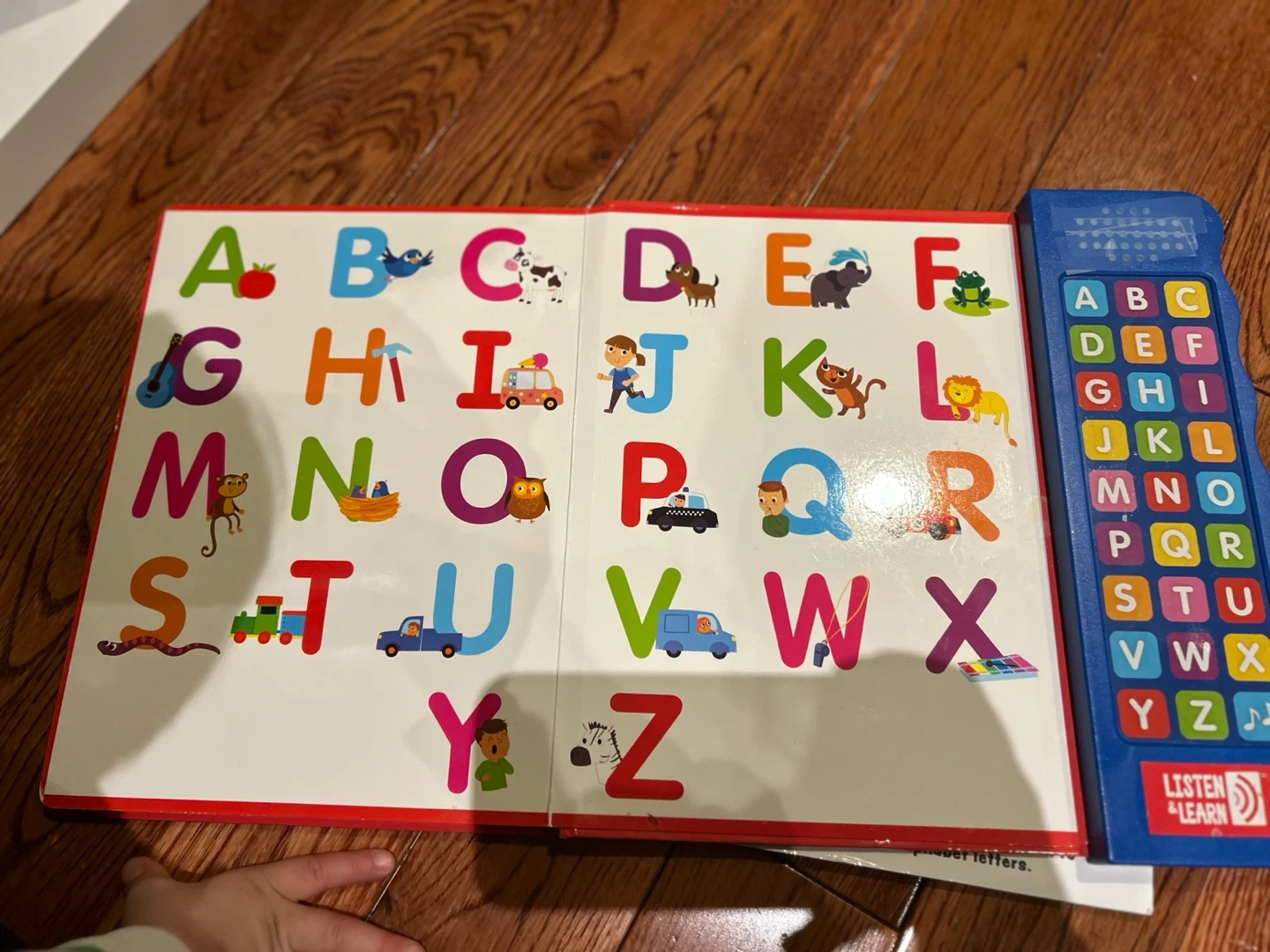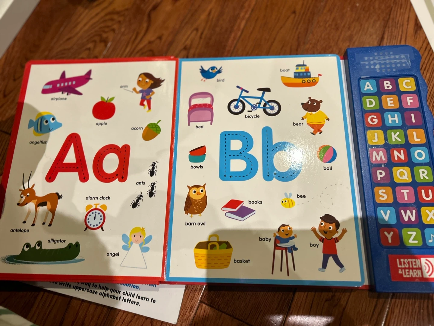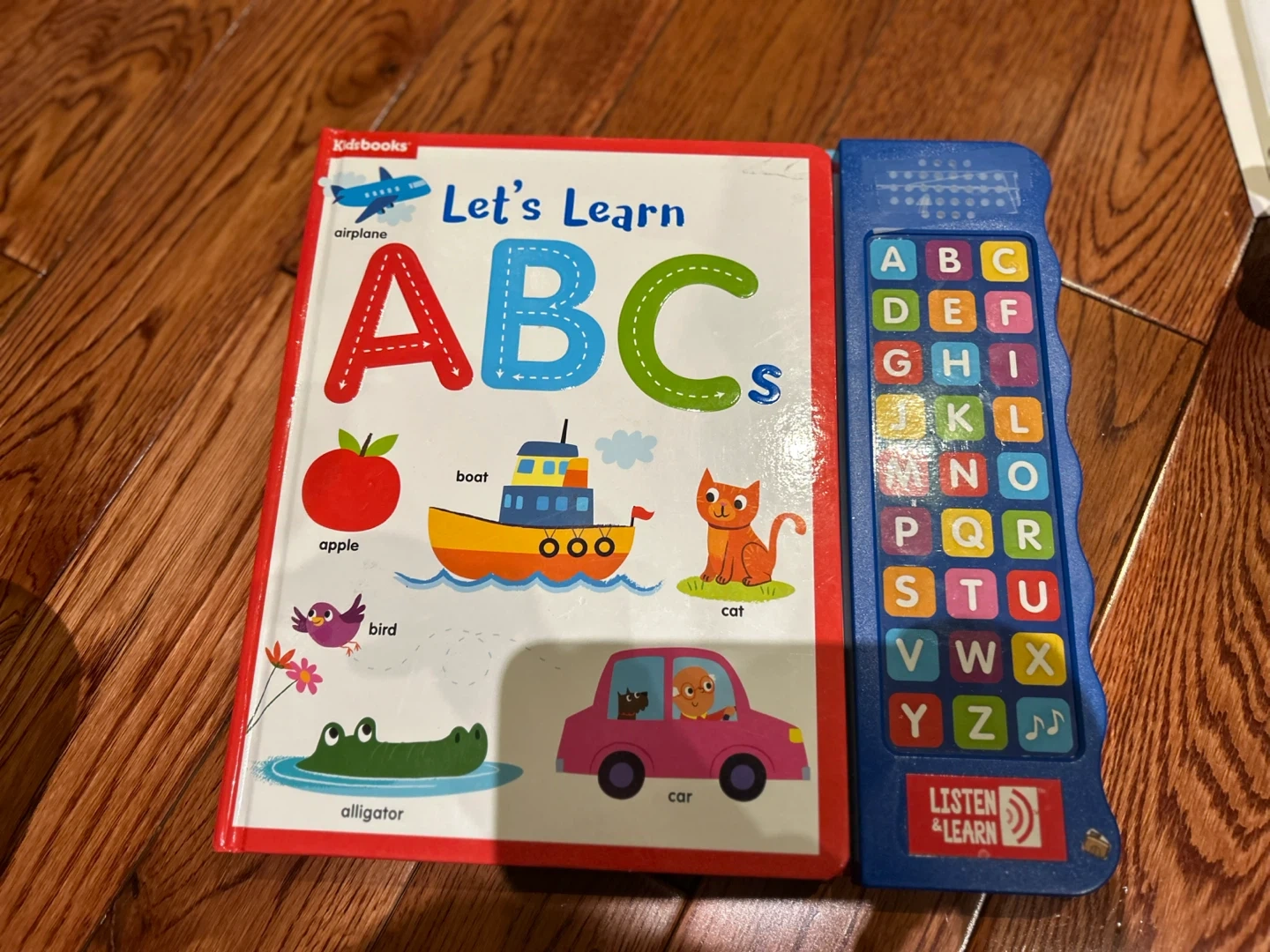 This interactive board book, "Let's Learn ABC," features large alphabet letters with corresponding images. It also has a built-in electronic module with alphabet buttons and sound effects. It's designed to help young children learn their letters and sounds!
