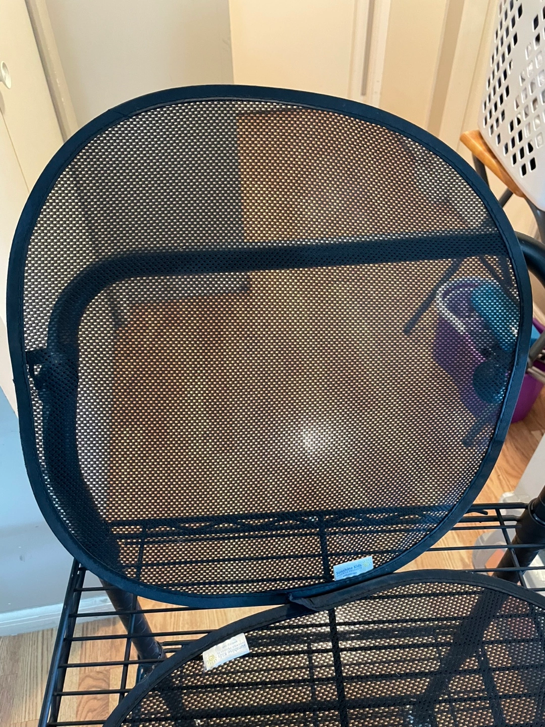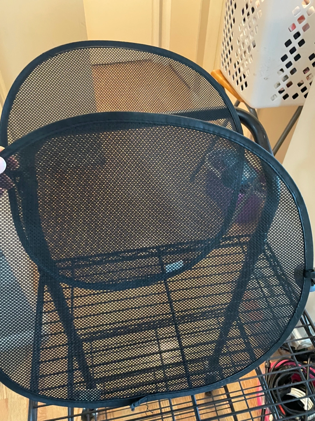 Two oval-shaped mesh car window shades. Keeps the sun out. Black mesh material. Easy to install.