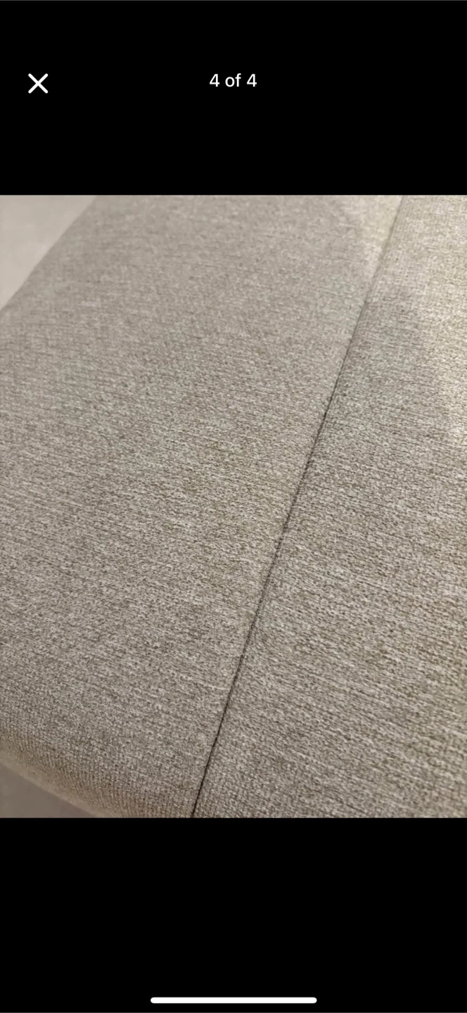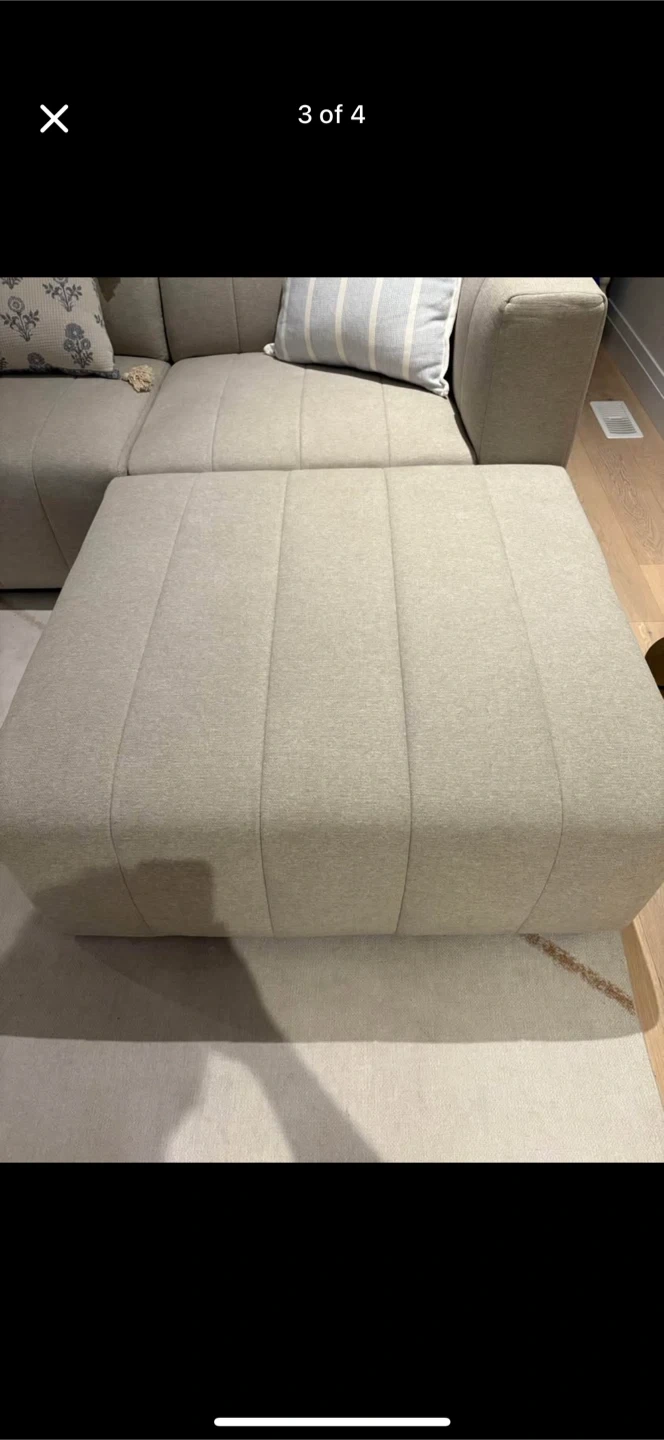 Comfortable light beige sectional sofa. Includes a large matching ottoman. Upholstered in a durable fabric, it's perfect for a living room or den. The modular design offers flexible arrangement options.