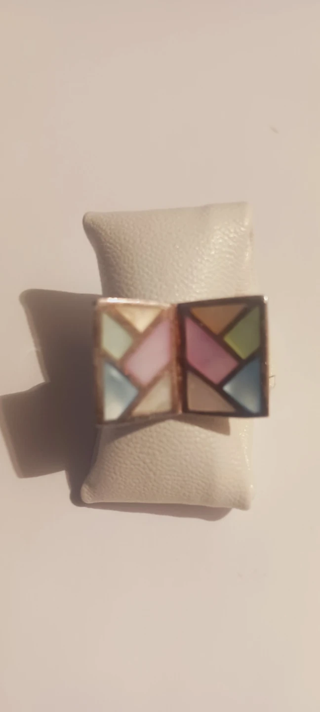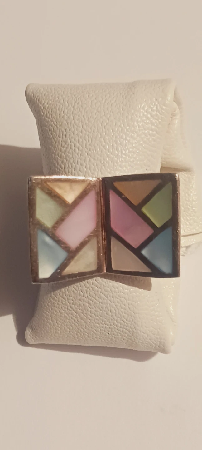 Sterling Silver 925 vintage ring featuring unique geometric inlay design. It's crafted with colorful pastel stones set in a sterling silver. A stylish statement piece for any jewelry collection! Size 6. Excellent condition. ALL MY PRICES ARE NEGOTIABLE !!