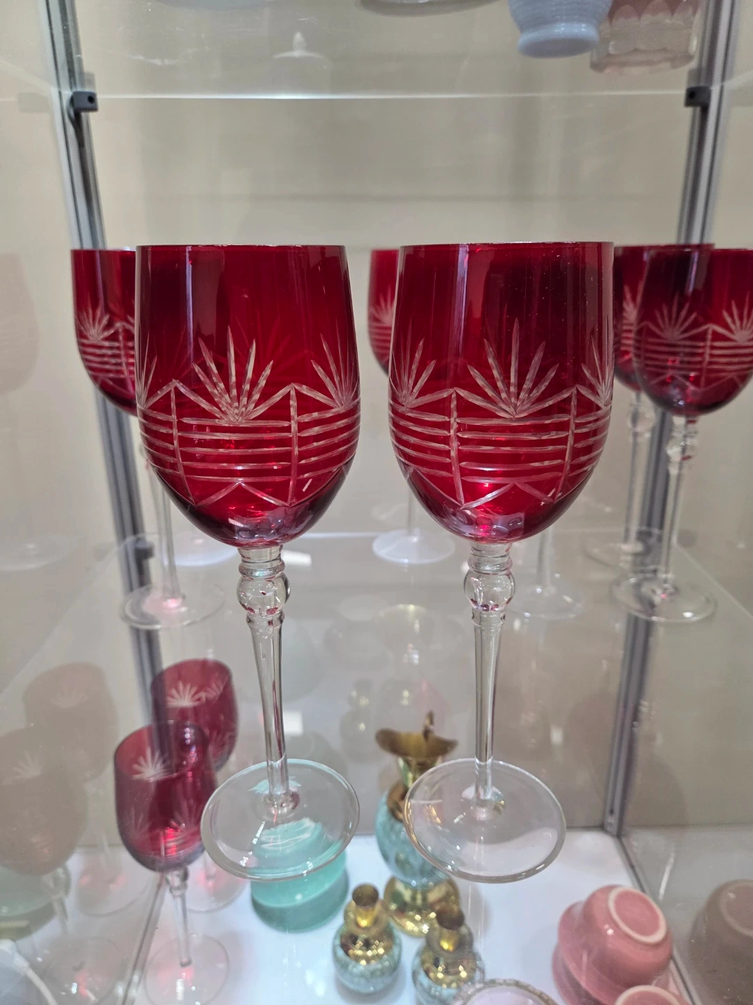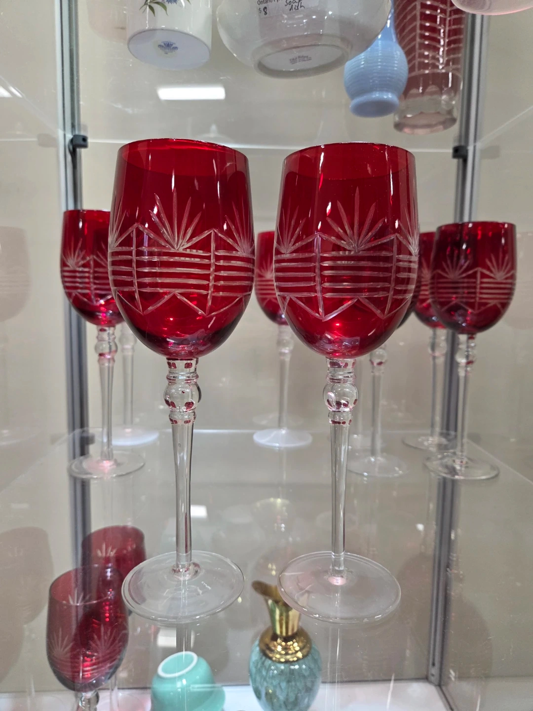 Beautiful red etched wine glasses, set of four. These glasses feature a delicate etched design on the bowl and a clear stem. Perfect for special occasions or elegant entertaining!