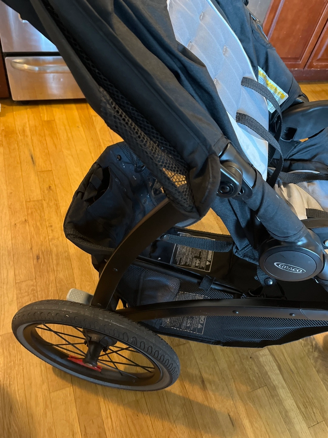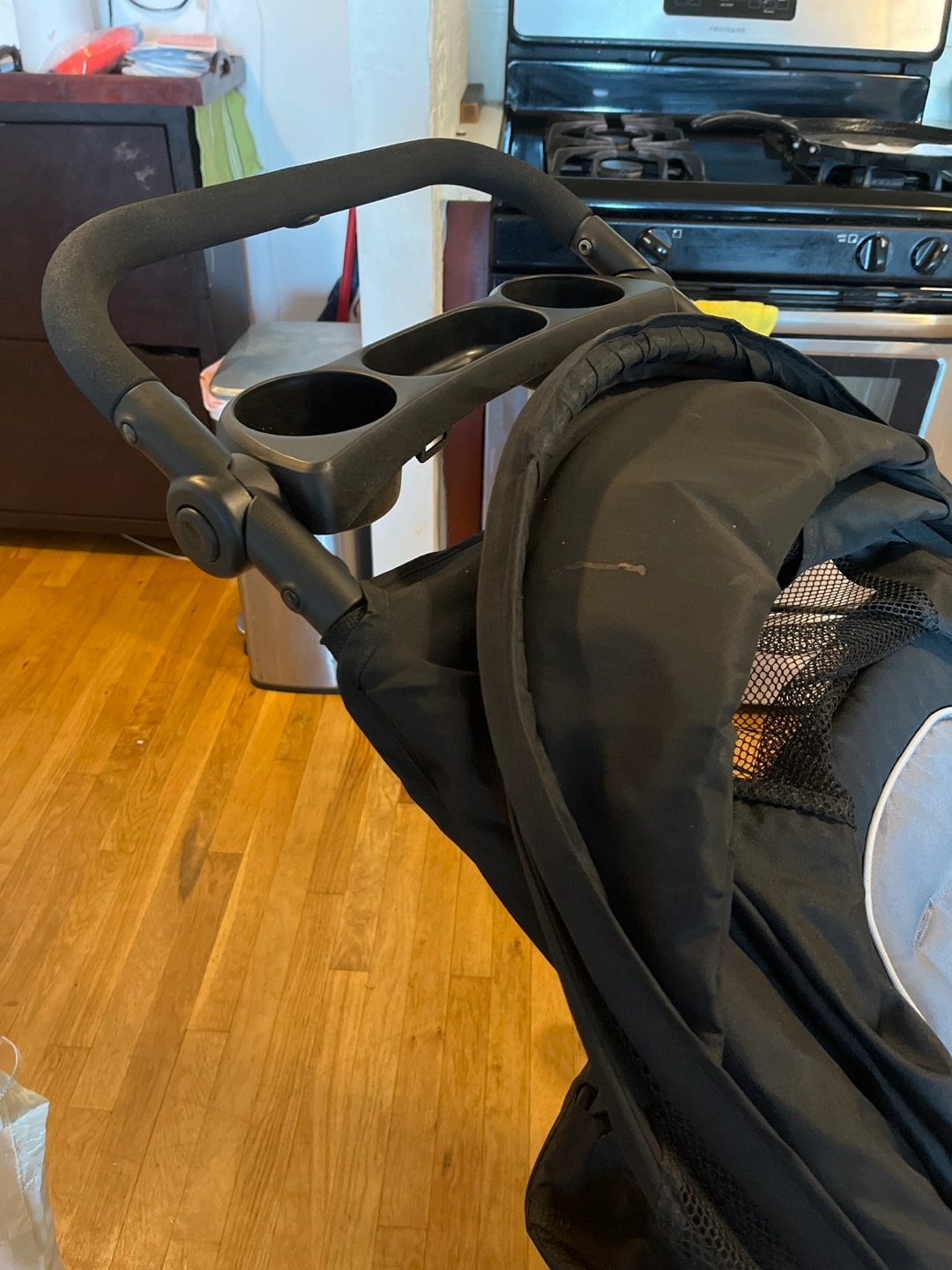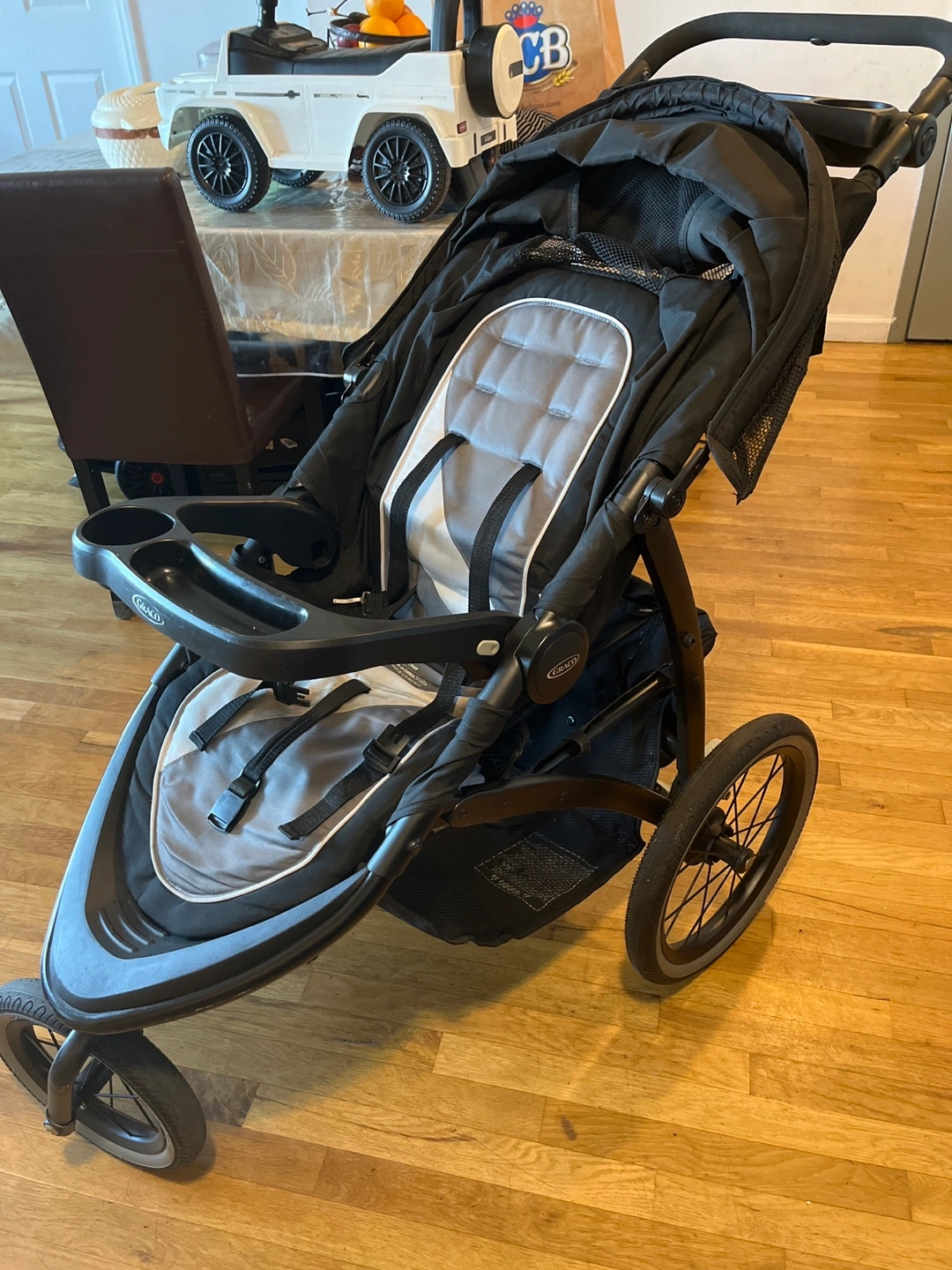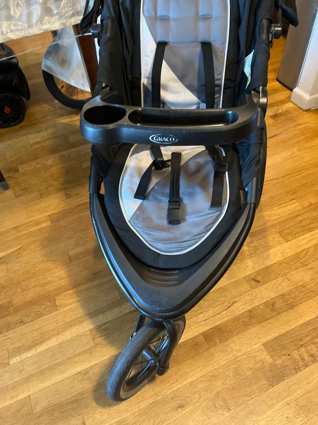 Graco Black and gray jogger stroller. 3-wheeled. Has a cup holder for adult and kids