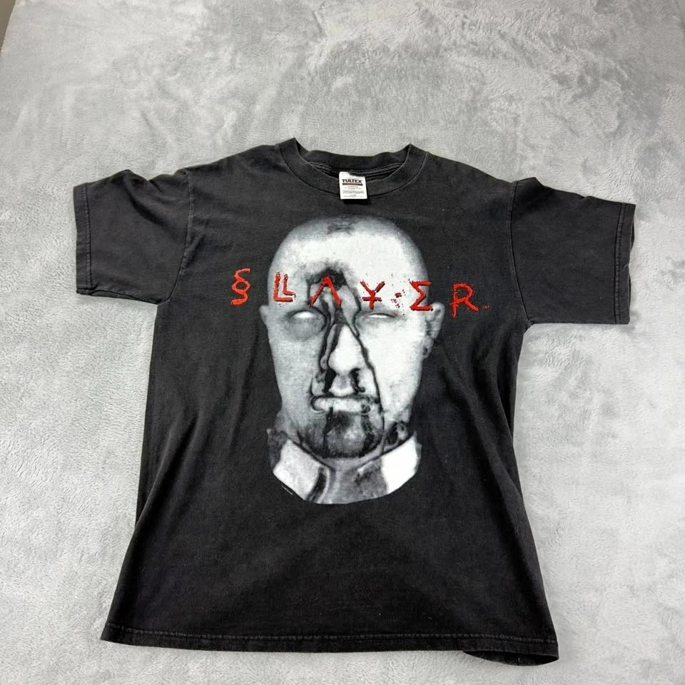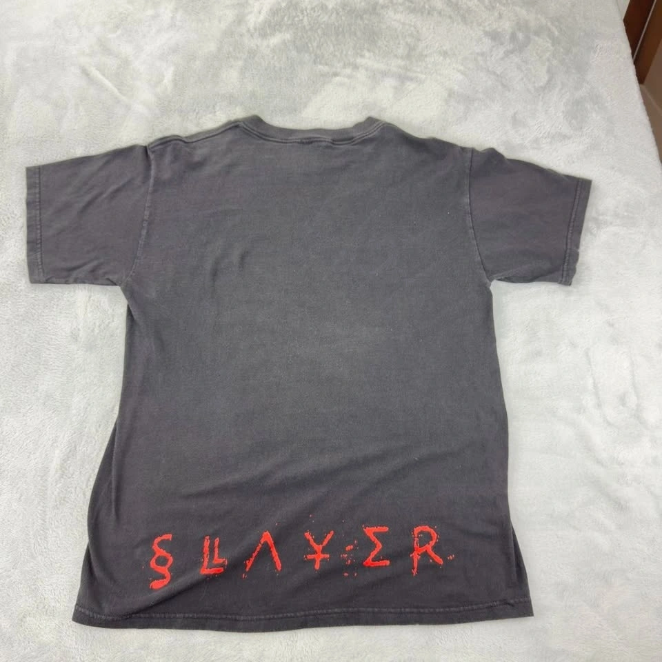 Vintage Slayer Men's Size Large Musica Diabolus Metal T-Shirt. 100% Cotton. Made in Mexico. Measurements: Armpit to armpit 21", Sleeve length 5.5", Length (Back of Collar to Bottom of Hem) 28". Size Large. Color Black. Brand Tultex. See pics for reference.