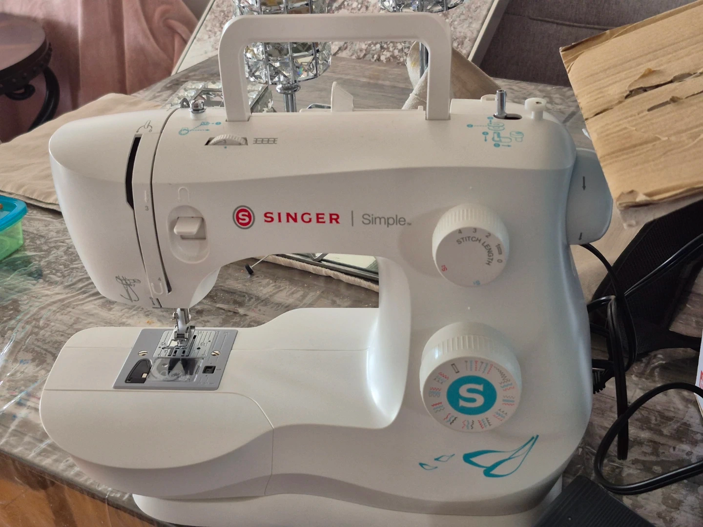 This SINGER sewing machine is white and has multiple stitch settings. It comes with a foot pedal and power cord. Great for home sewing projects!
