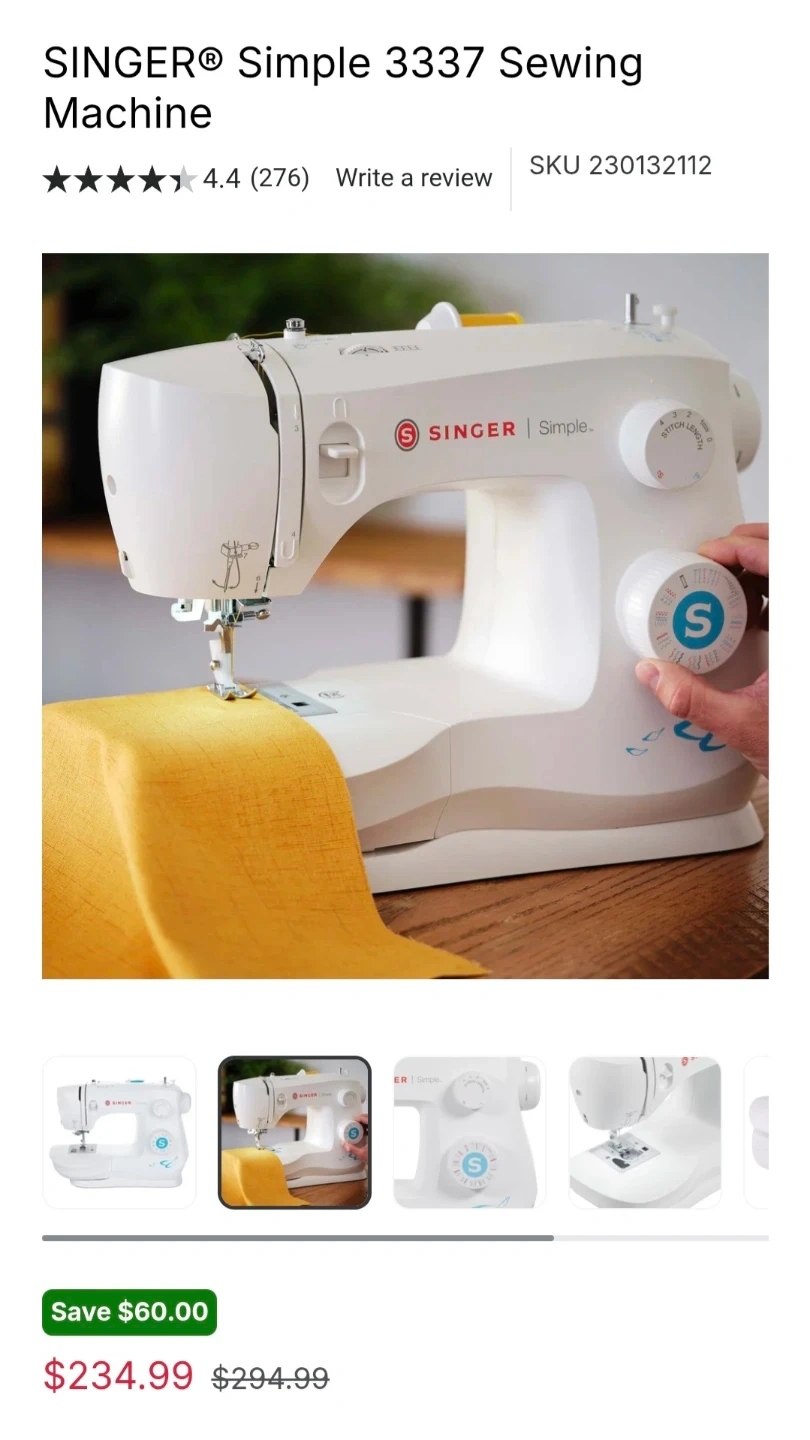 This SINGER sewing machine is white and has multiple stitch settings. It comes with a foot pedal and power cord. Great for home sewing projects!