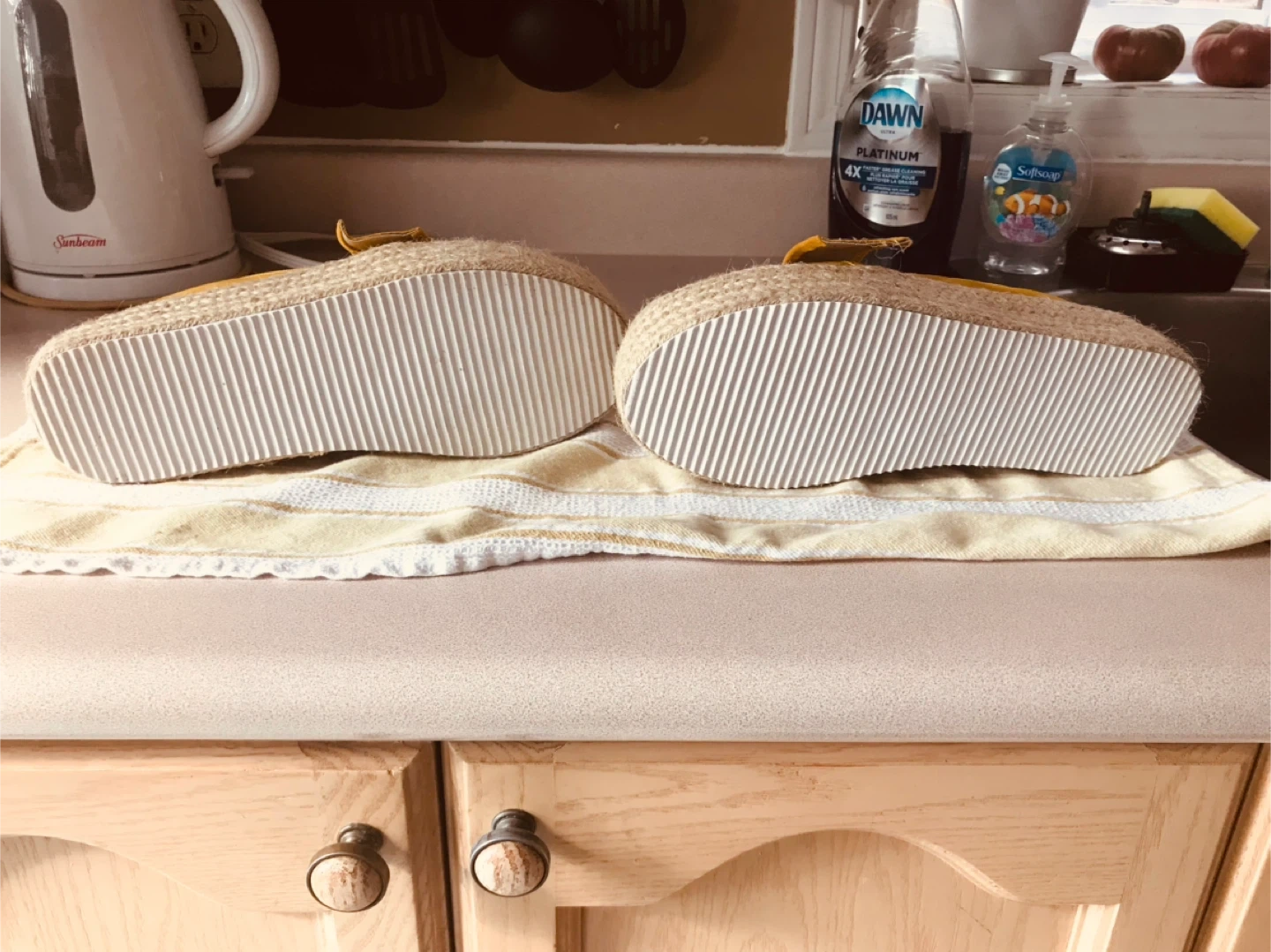 These are some cute yellow espadrille platform loafers! They have a bow detail on the front and would be a great addition to your wardrobe. They appear to be in good condition!