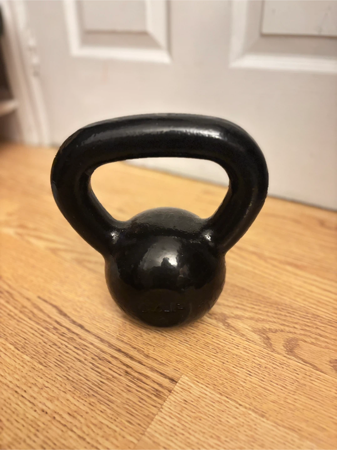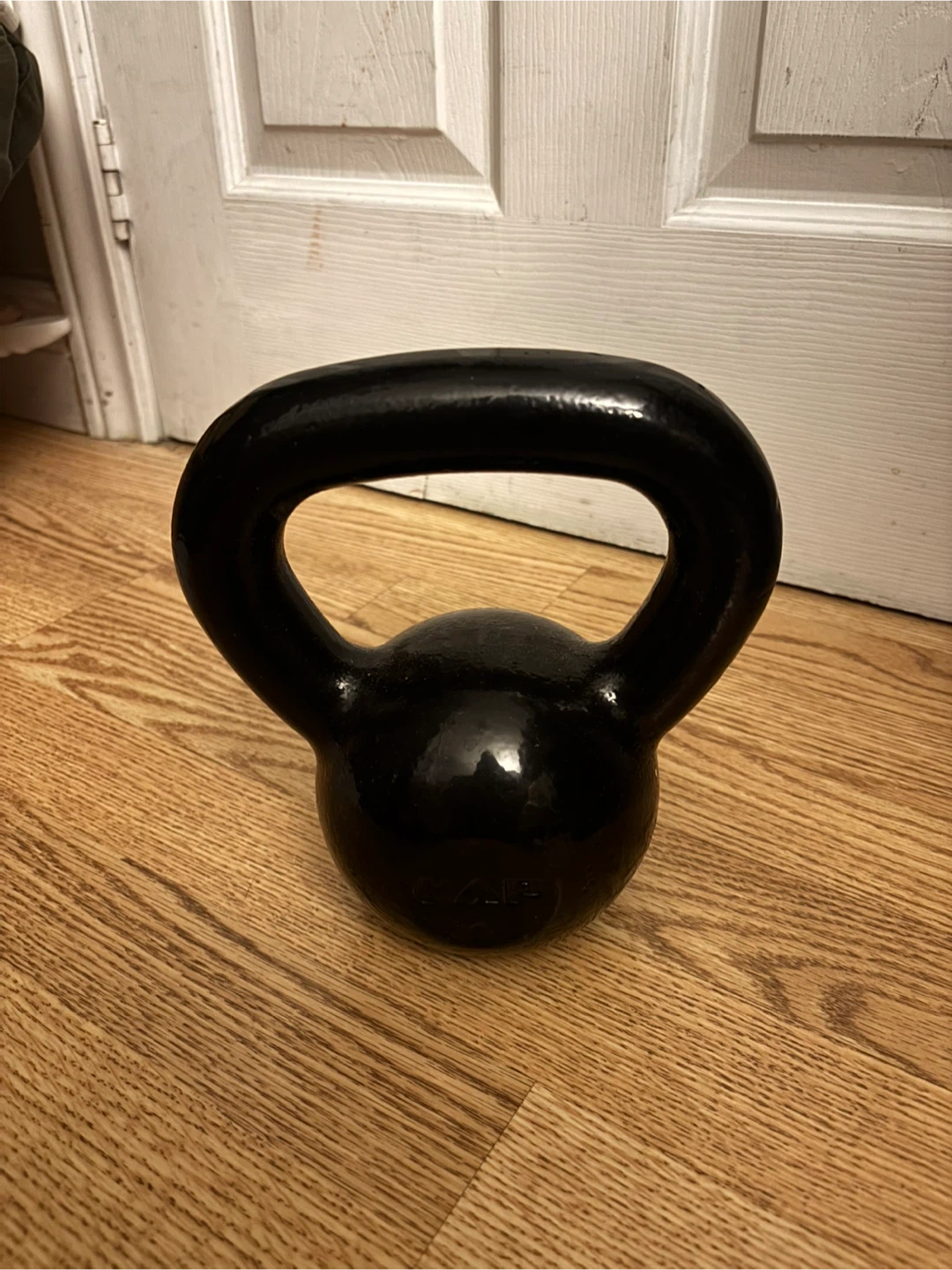 This is a black cast iron kettlebell. It's suitable for strength training and conditioning. Weights like this are useful for a variety of exercises.
