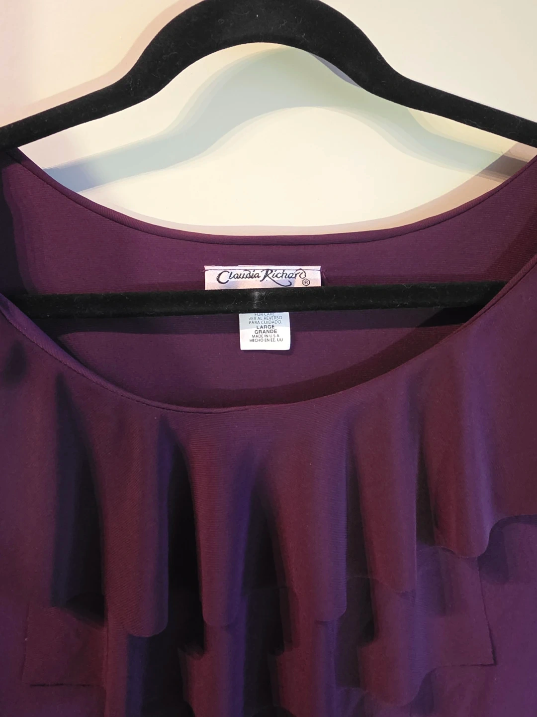 This is a 3/4 length sleeve deep purple top by Claudia Richard. It has a decorative ruffled neckline. Made of a blend of polyester and spandex. Size is large.
