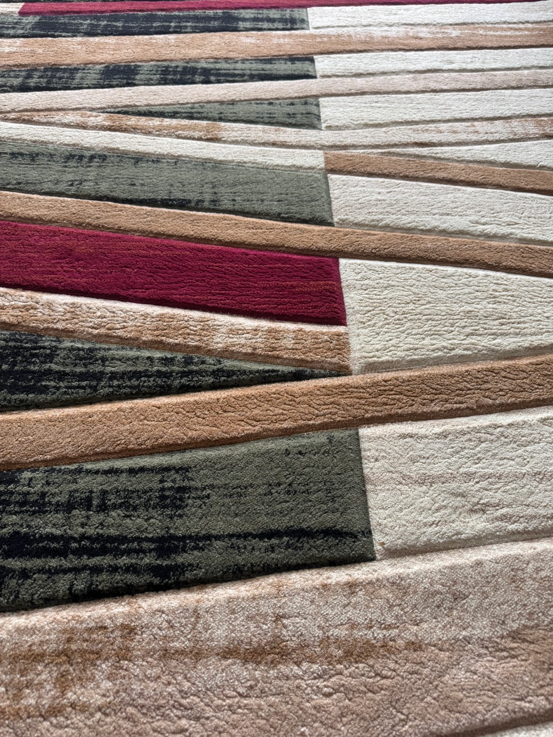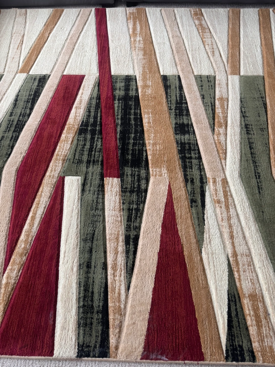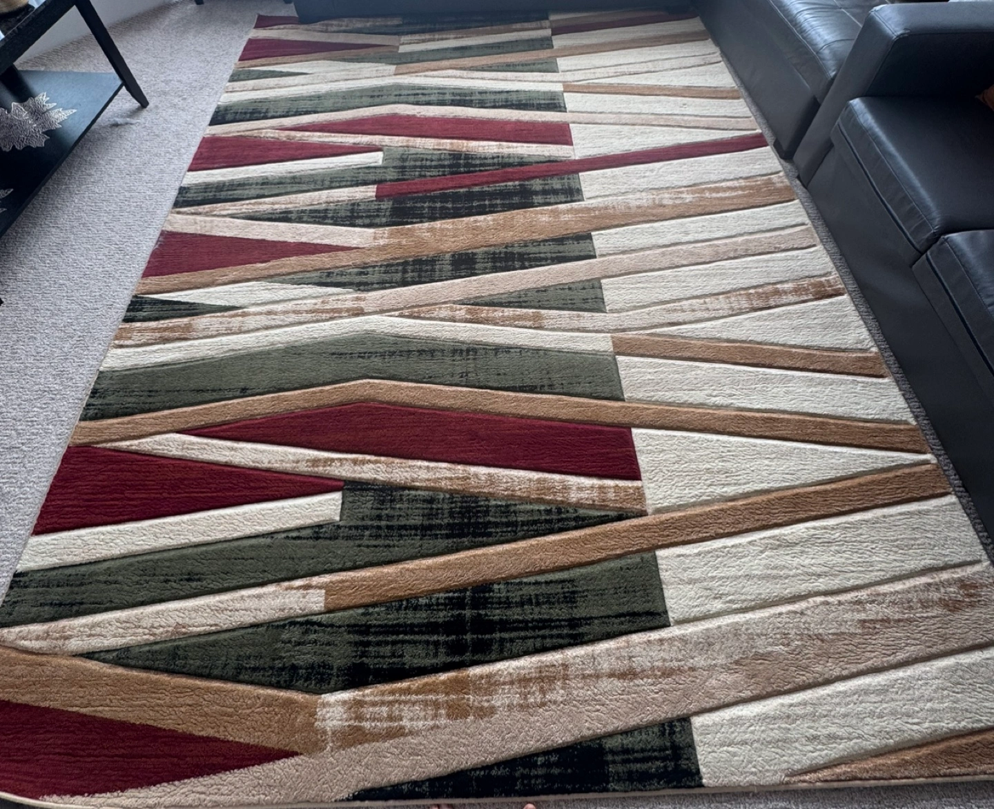 Modern area rug. Geometric pattern. Red, beige, and green tones. Good condition. Clean and pretty ki