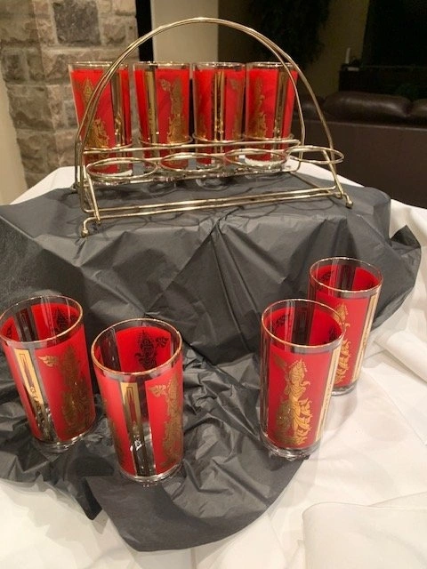Set of 8 Vintage Culver "Thai Goddess" highball glasses in a red and gold design with a carrier.